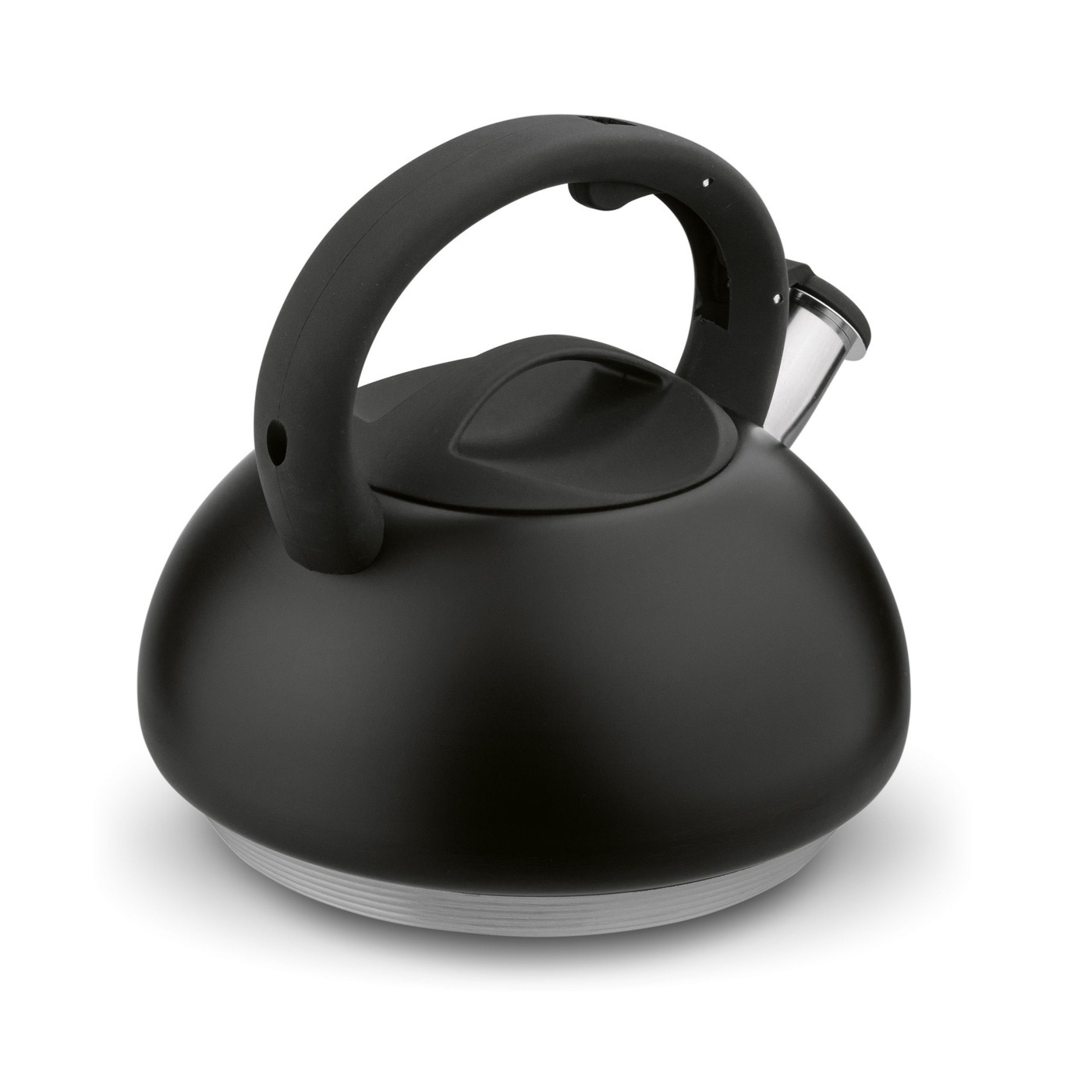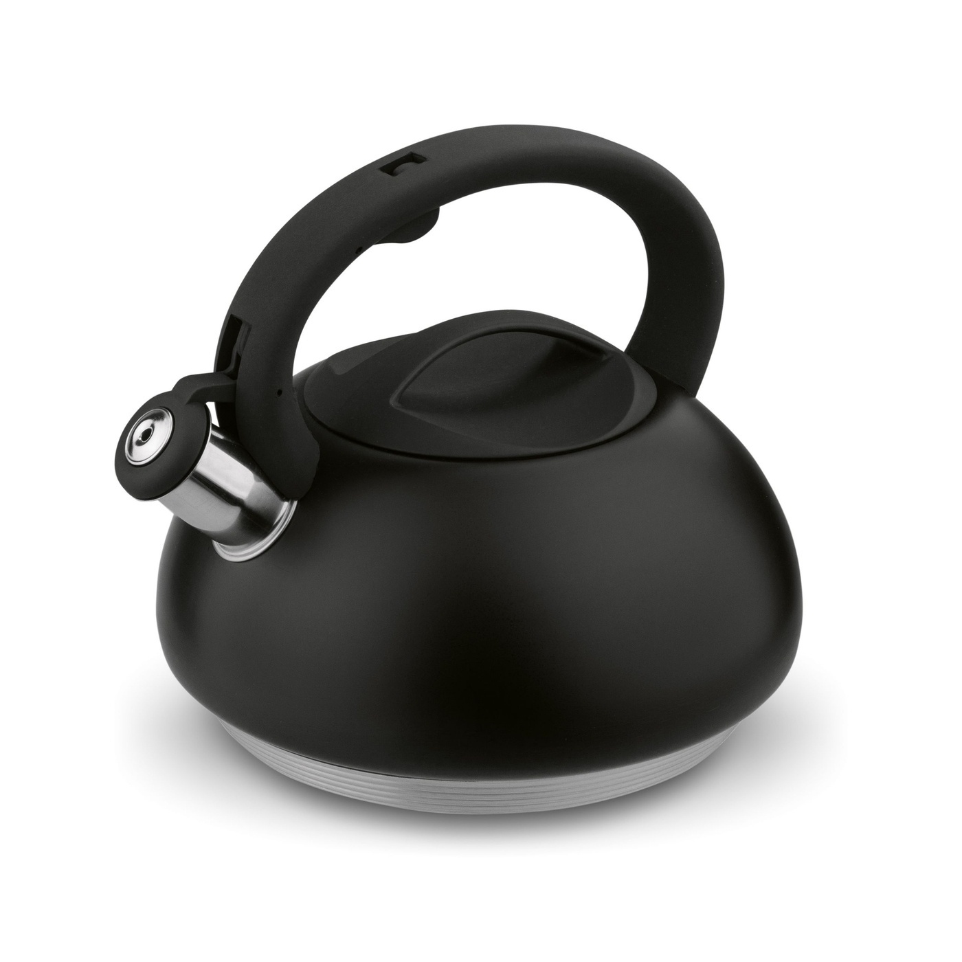 Другая информация: - стальной чайник с черным порошковым покрытием, - отделка: глянцевая, - крышка и ручка отделаны мягким на ощупь пластиком, - фиксированный свисток, - эффект пятиступенчатого дна, - полезный объем : 2,5 л