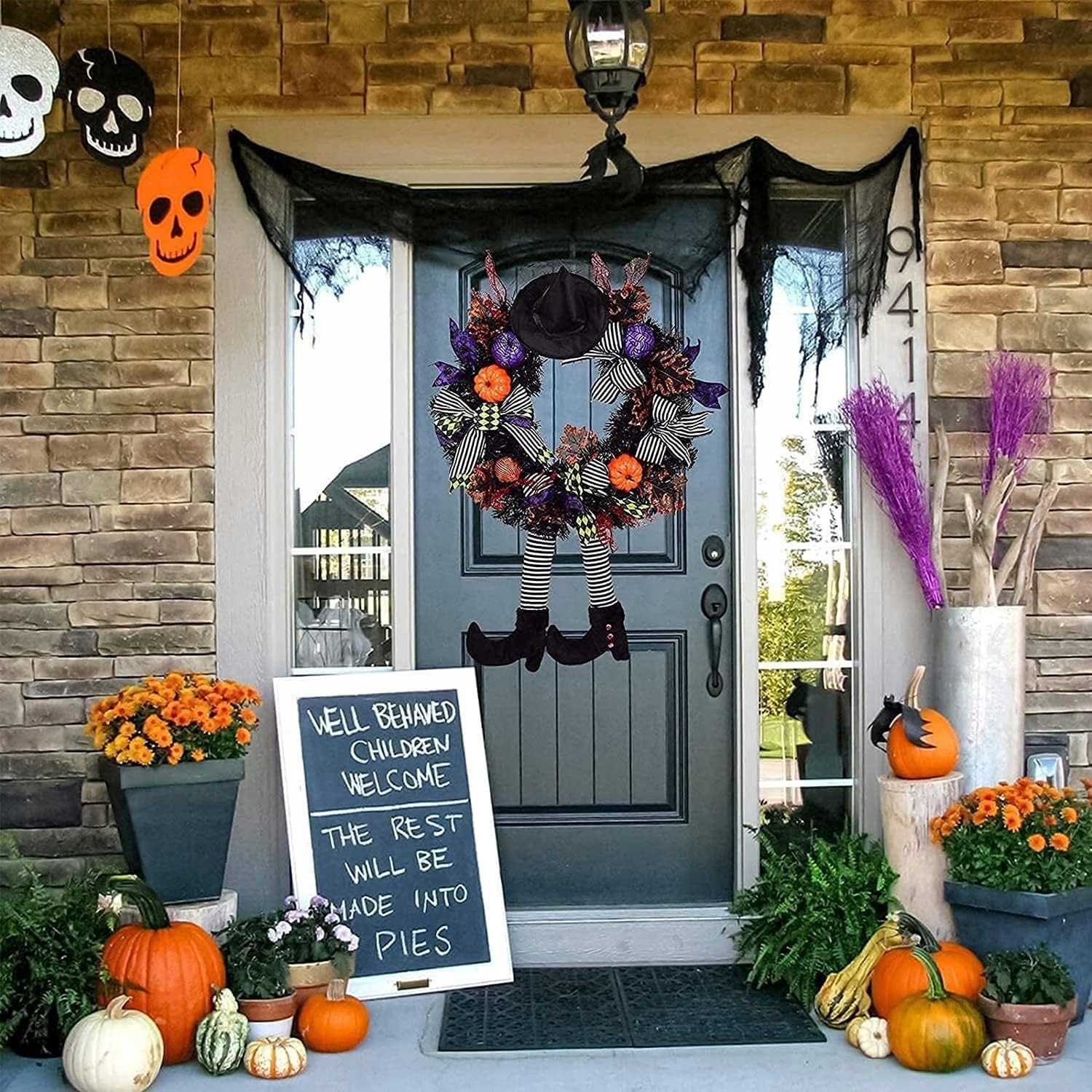 Этот уникальный черный венок на Хэллоуин диаметром 60 см — идеальное украшение для двери, которое привнесет в ваш дом мрачную и веселую атмосферу. дом. Венок в форме классического украшения, дополненный шляпой ведьмы и выступающими ногами ведьмы, привлекает внимание и добавляет игривую атмосферу в композицию на Хэллоуин.