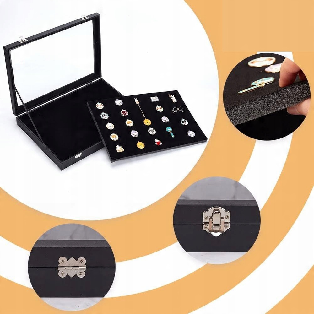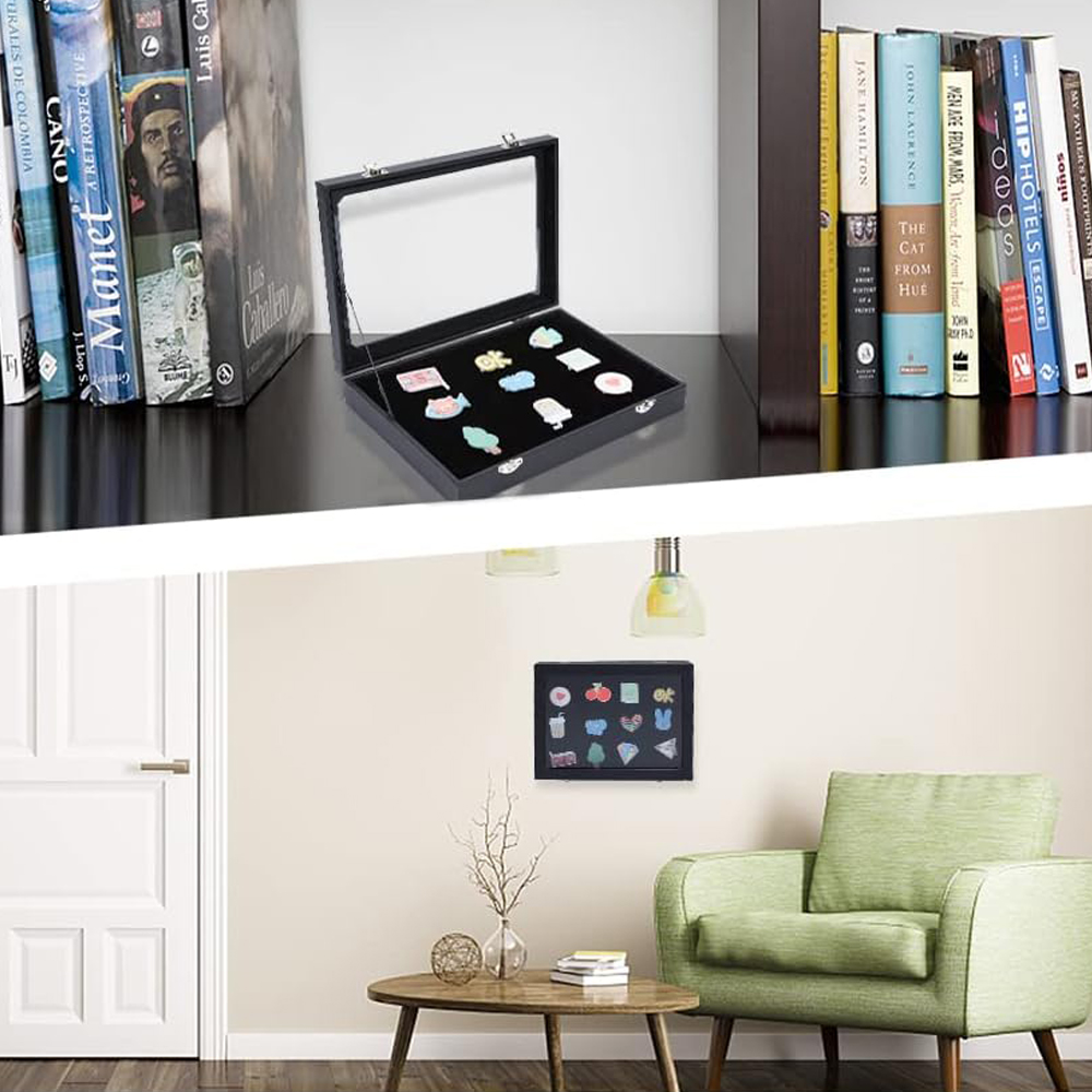 Витрина имеет прозрачную стеклянную крышку, на которой четко видно хранящиеся значки, украшения, а также крышку, которая помогает сохранять предметы в чистоте и защищенности от посторонних предметов. пыль.