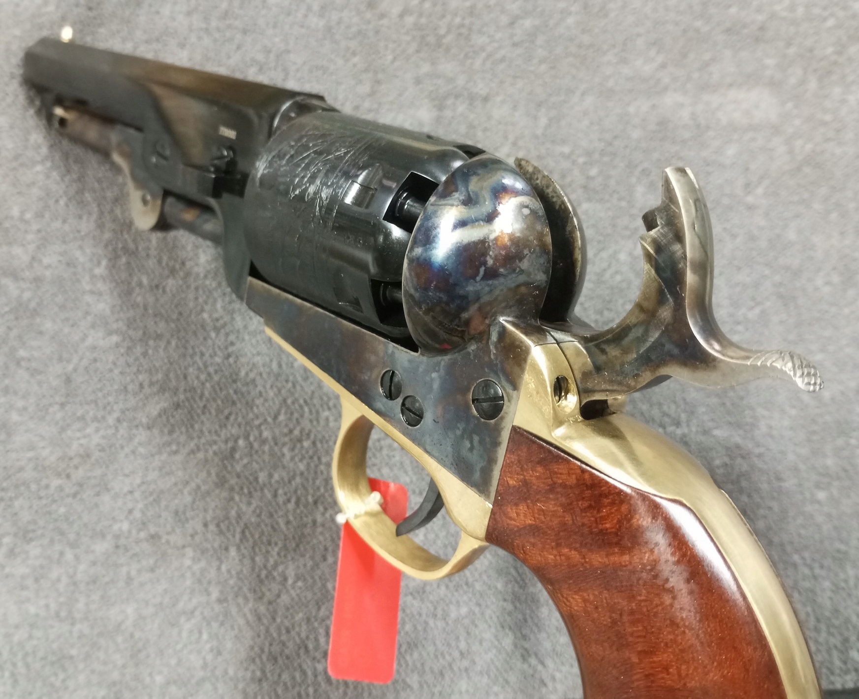 Конструкция - открытая рама из закаленной стали, а также воротник.Черный оксидированный, гравированный 6-камерный барабан и восьмиугольный ствол длиной 5" (шаг резьбы 1-30"). Спусковая скоба (триммерная скоба) и детали рукоятки изготовлены из полированной латуни. Прицельные приспособления, неподвижная мушка из латуни.
