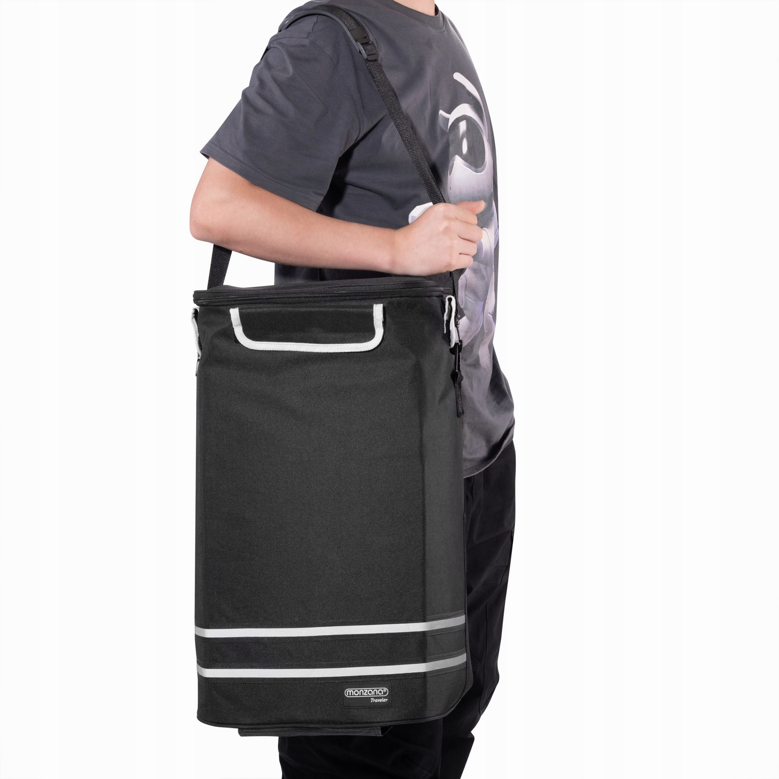 Сумка на колесиках крепится к раме с помощью застежки-липучки, имеет чрезвычайно прочные молнии и может использоваться индивидуально как сумка через плечо с помощью регулируемого плечевого ремня.