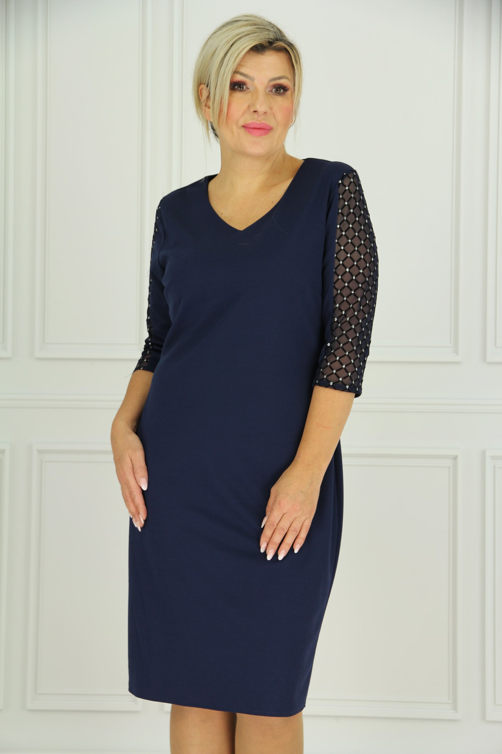 - Платье больших размеров с V-образным вырезом сверху, дополненное сетчатыми рукавами с блестками.