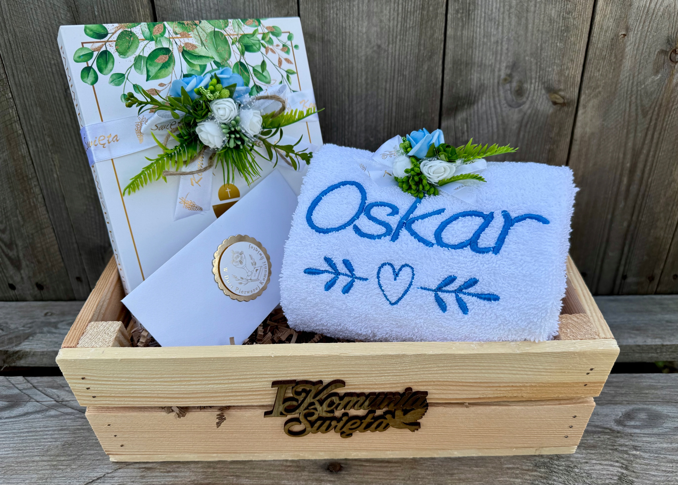 Уникальный и красивый набор: Библия с персонализацией, объемный Сувенир Первого Причастия, декоративно упакованный в элегантную коробку, в комплект входит конверт для денег и вышитое полотенце - прекрасный подарок к Первому Причастию - практичный и оригинальный.