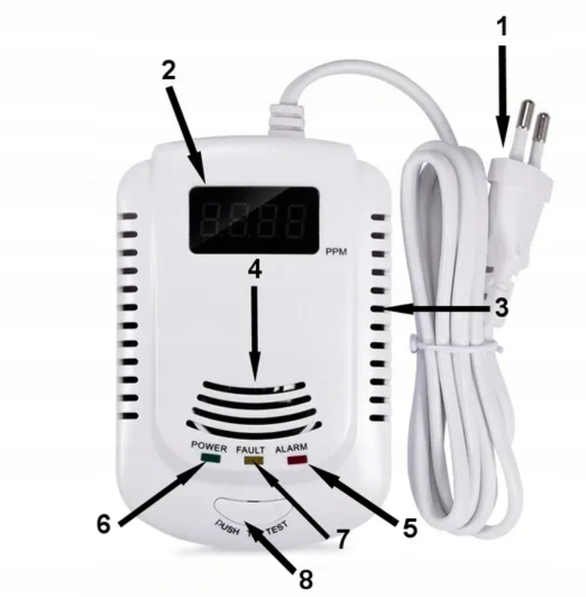 - < б>Датчик: полупроводниковые/каталитические датчики.; обнаруживает угарный газ и горючие газы (например, сжиженный нефтяной газ (СНГ), природный газ, метан и т. д.)