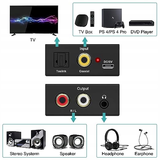 - Цифро-аналоговый преобразователь AMANKA. Цифро-аналоговый преобразователь преобразует цифровой оптический коаксиальный кабель Toslink в аналоговый звук L/R RCA и аудиоразъем 3,5 мм. ул >