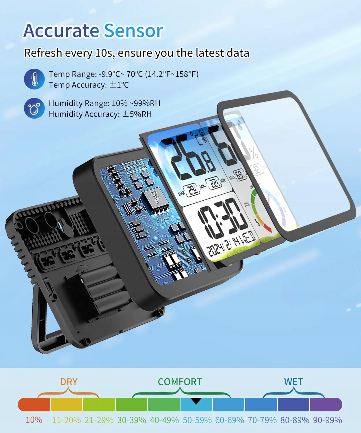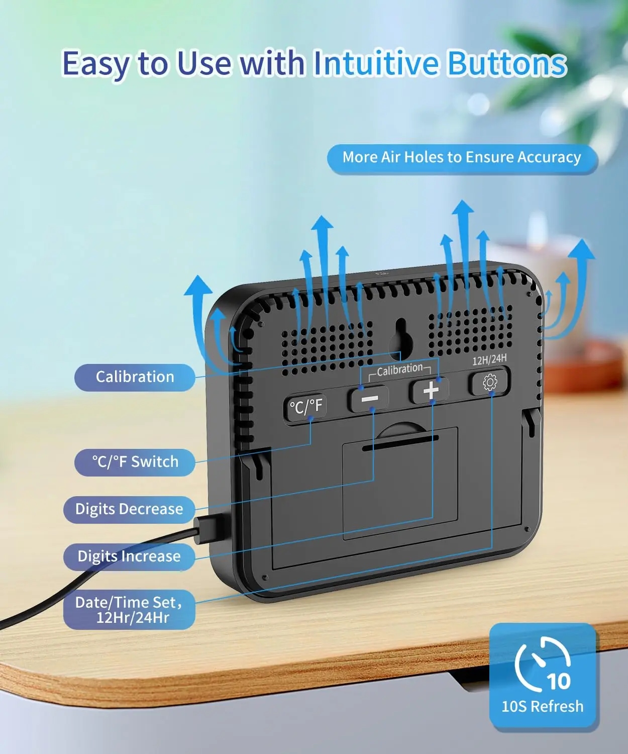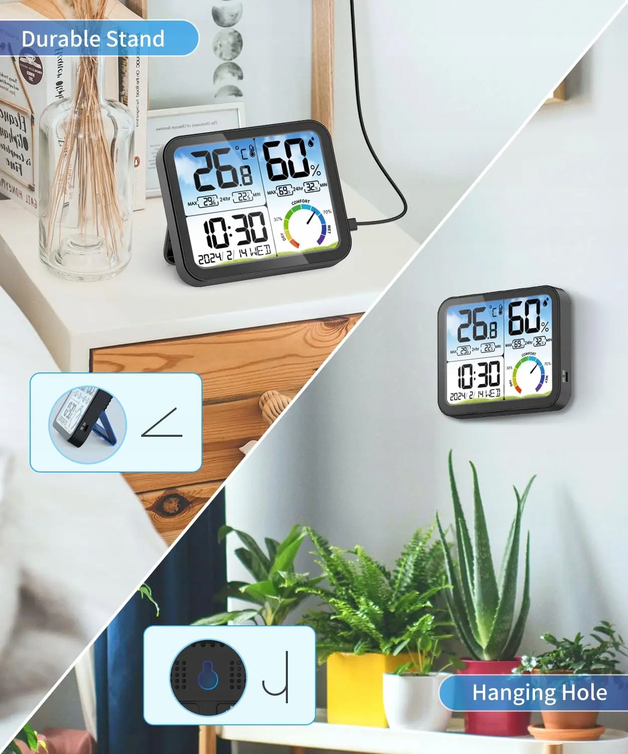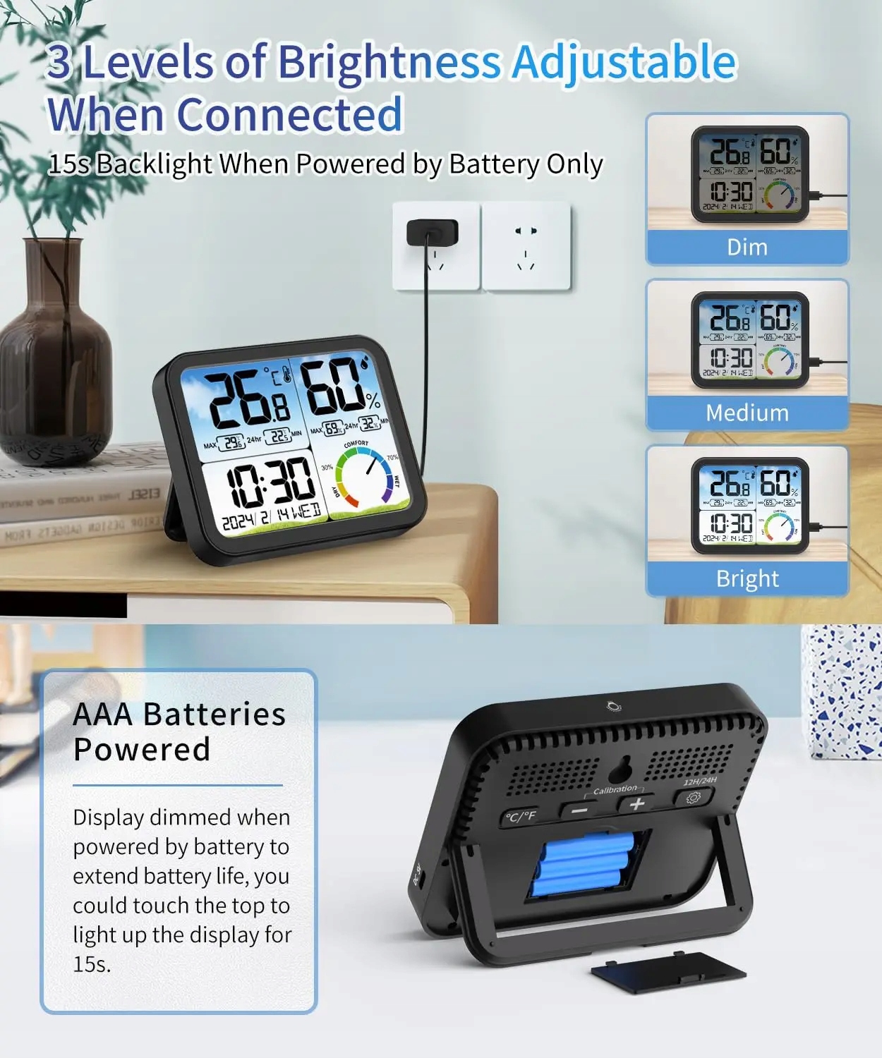 Индикатор комфорта чистого воздуха и калибровка: эксклюзивное, прозрачное цветовое колесо, обеспечивающее быстрое указание сухого/комфорта/влажного воздуха с одной проекцией глаз. Необходимо показать точно те же данные о других брендах, функция калибровки была добавлена h1> 2 Методы подачи и регулировки яркости: этот термометр дома может быть подключен к любому USB -зарядному устройству к мощности. Основное из батареи, яркости не может быть отрегулирована, чтобы продлить срок службы батареи. Сервис. Для зарядки этого устройства вы можете использовать любое 5 В