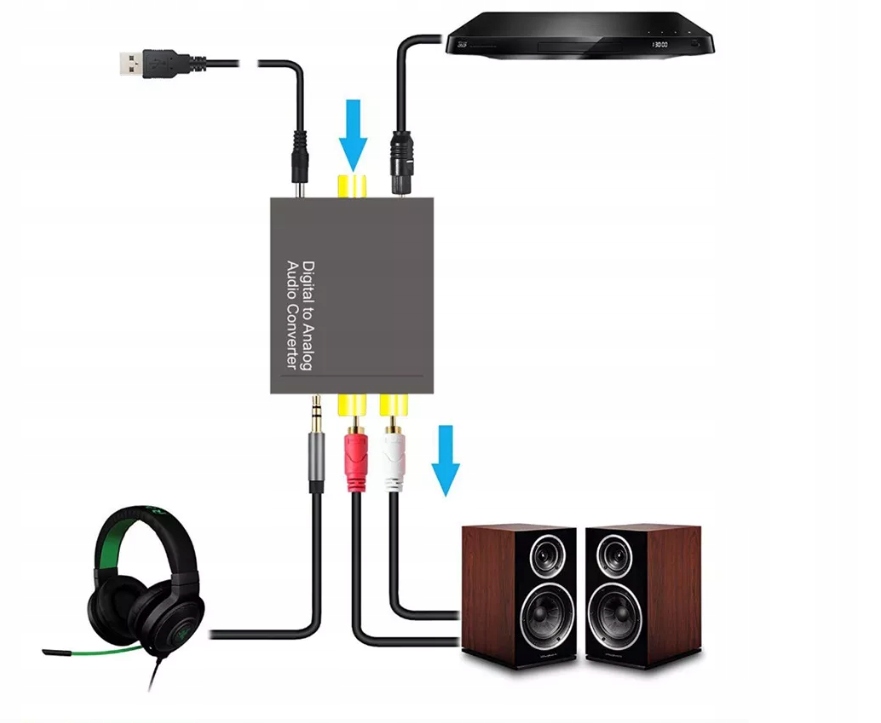 DAC (Digital Audio Converter) — преобразователь, преобразующий цифровой сигнал (в виде цифровых данных), обычно передаваемый по оптическому кабелю, в аналоговый сигнал (в виде электрический ток). Он имеет широкий спектр применения при подключении домашних устройств - отправке цифрового сигнала - таких как телевизоры нового поколения, к звуковым системам, которые поддерживают только аналоговый сигнал, например, вышки Hi-Fi, домашние кинотеатры, активные динамики и т. д. К конвертеру также можно подключиться через разъем COAXIAL.