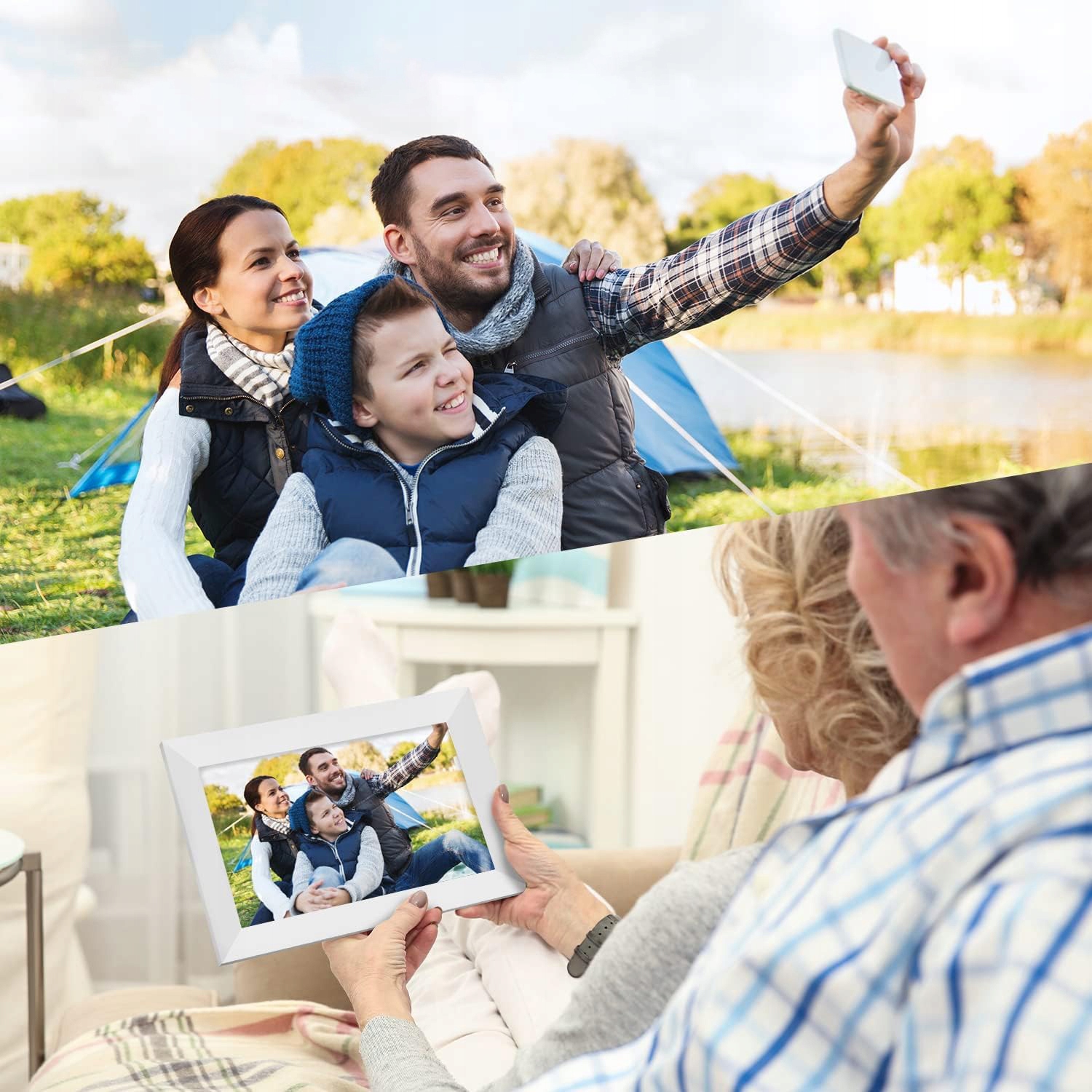 Пригласите неограниченное количество друзей и семьи, чтобы отправить фотографии в ваш кадр или отправить фотографии на свой кадр через Wi-Fi; Подарок для пожилых людей, у которых не очень хорошо со смартфонами, чтобы оставаться в контакте с молодым поколением.