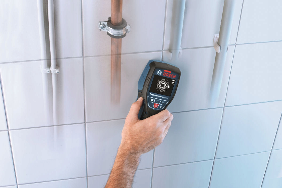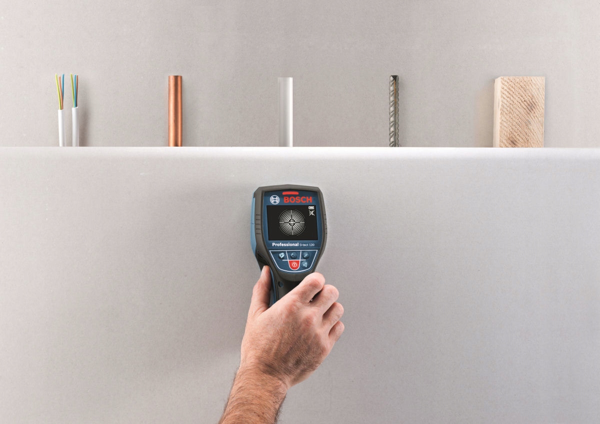 Цифровой универсальный детектор D-TECT 120 от BOSCH применяется для обнаружения пластиковых водопроводных труб, черных и цветных металлов, деревянных конструкций, электрических проводов и других кабелей, расположенных в стенах.