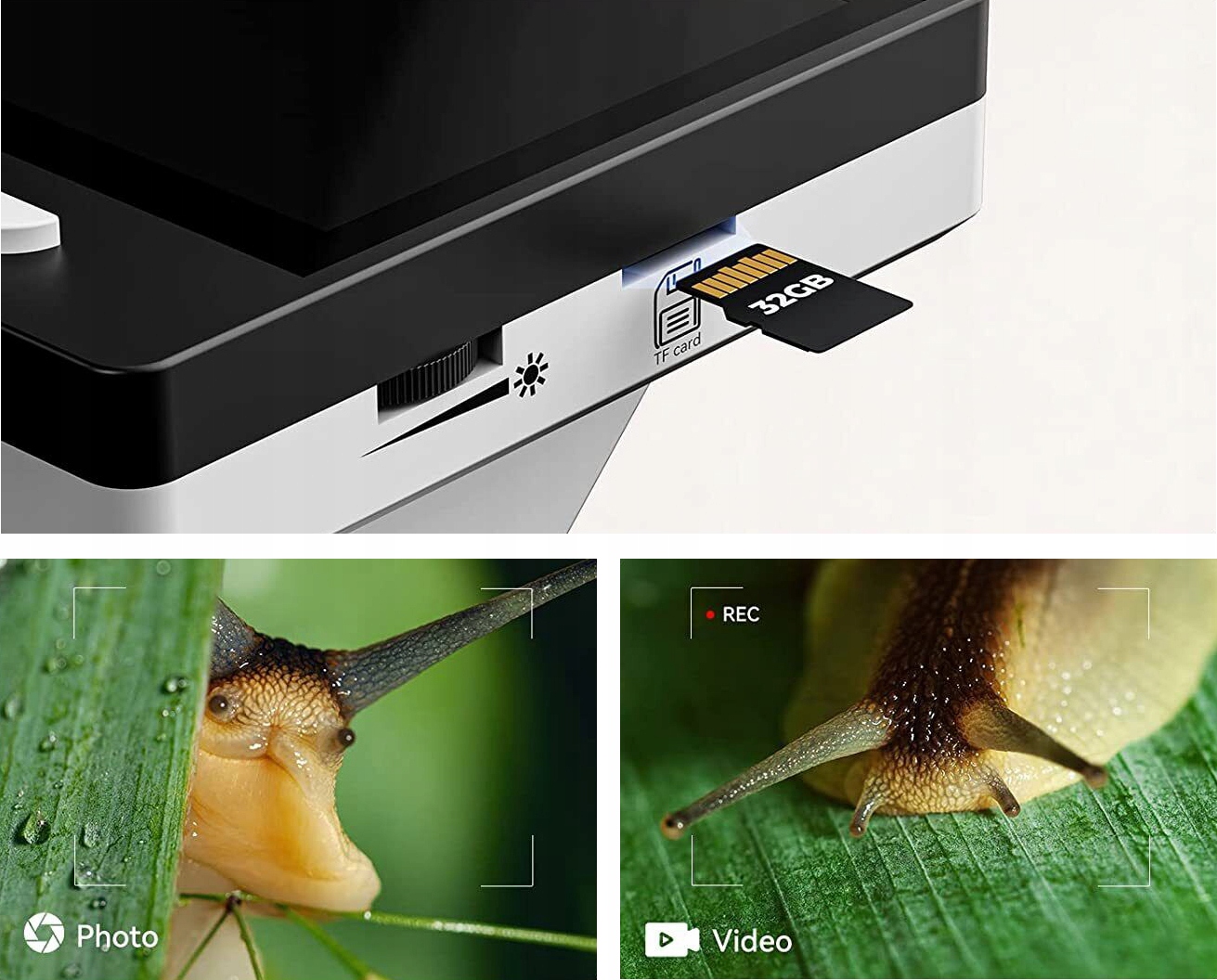 Одной из расширенных функций этого микроскопа является возможность записи видео и фотографий. Чтобы просмотреть записанные видео и фотографии на своем компьютере, просто подключите микроскоп к компьютеру. Материалы, сохраненные на карте памяти, можно воспроизводить на мониторе компьютера. Благодаря этой функции пользователь может записывать наблюдаемые изображения и анализировать их в любое время, что является ценным элементом исследования и документации.