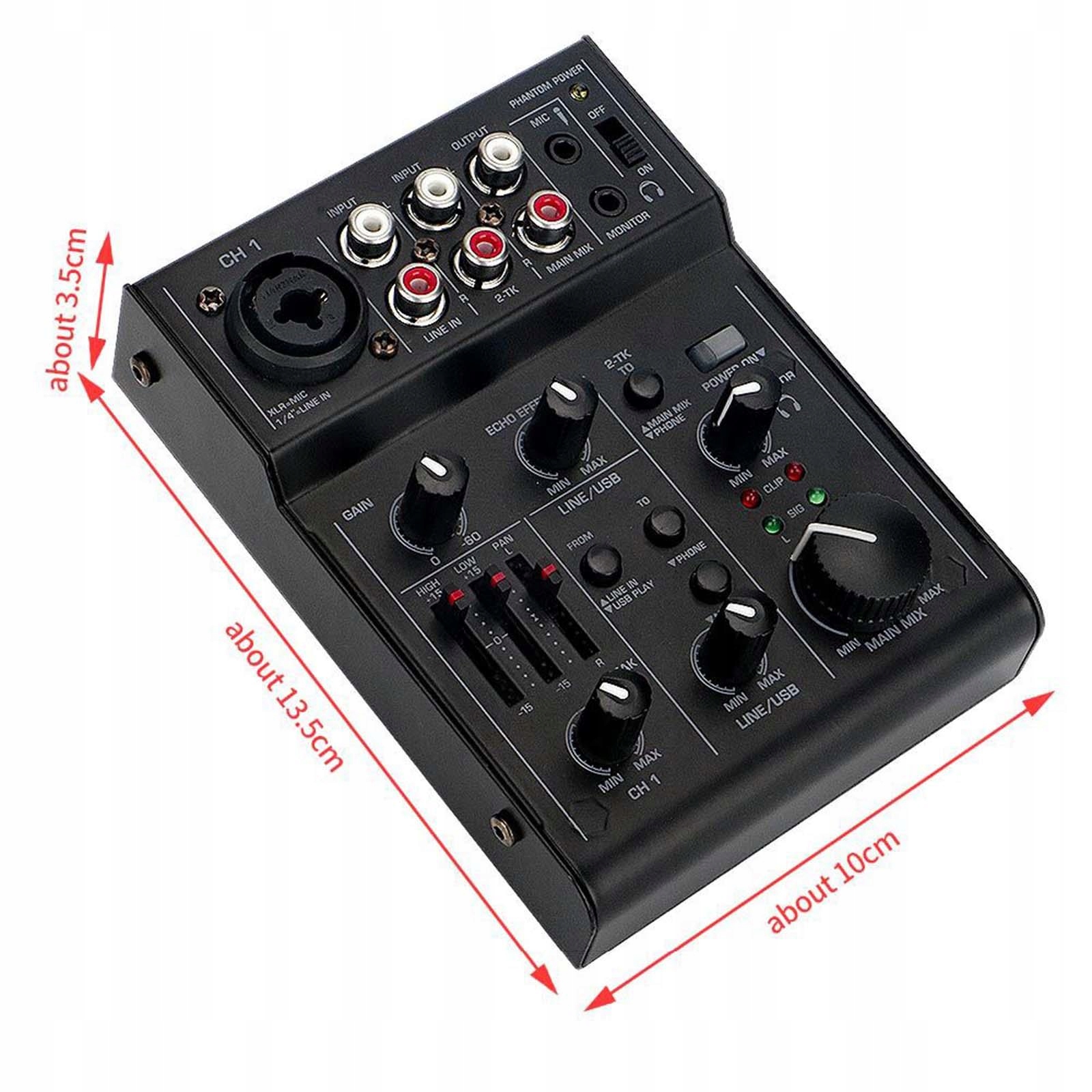 [Мини-музыкальный микшер]: практичная регулировка эффекта реверберации, небольшой размер, модный внешний вид, чистое качество звука, регулировка высоких и низких тонов, регулировка усиления, регулировка реверберации.