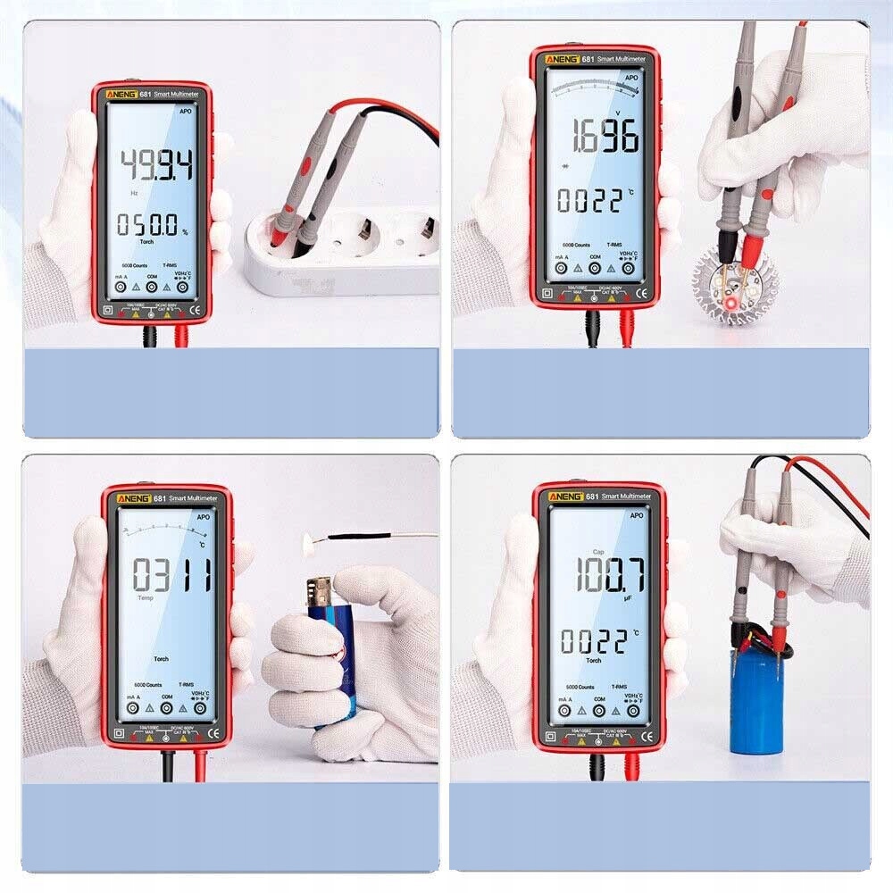 Прибор имеет ЖК -экран с аналоговым дисплеем и 6000 расчетов эффективного значения. Предотвратить риск удара электрическим током. Сопротивление, диод, емкость, зуммер, ток округа Колумбия, ток переменного тока, температура