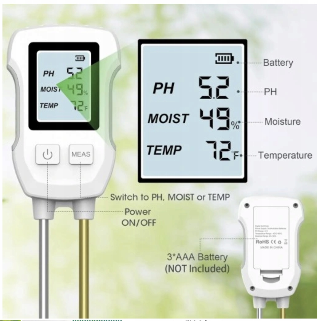 Цифровой измеритель почвы 3 в 1 с ЖК-дисплеем, тестер pH/влажности/температуры почвы с подсветкой для домашних растений, газона, сада, фермы