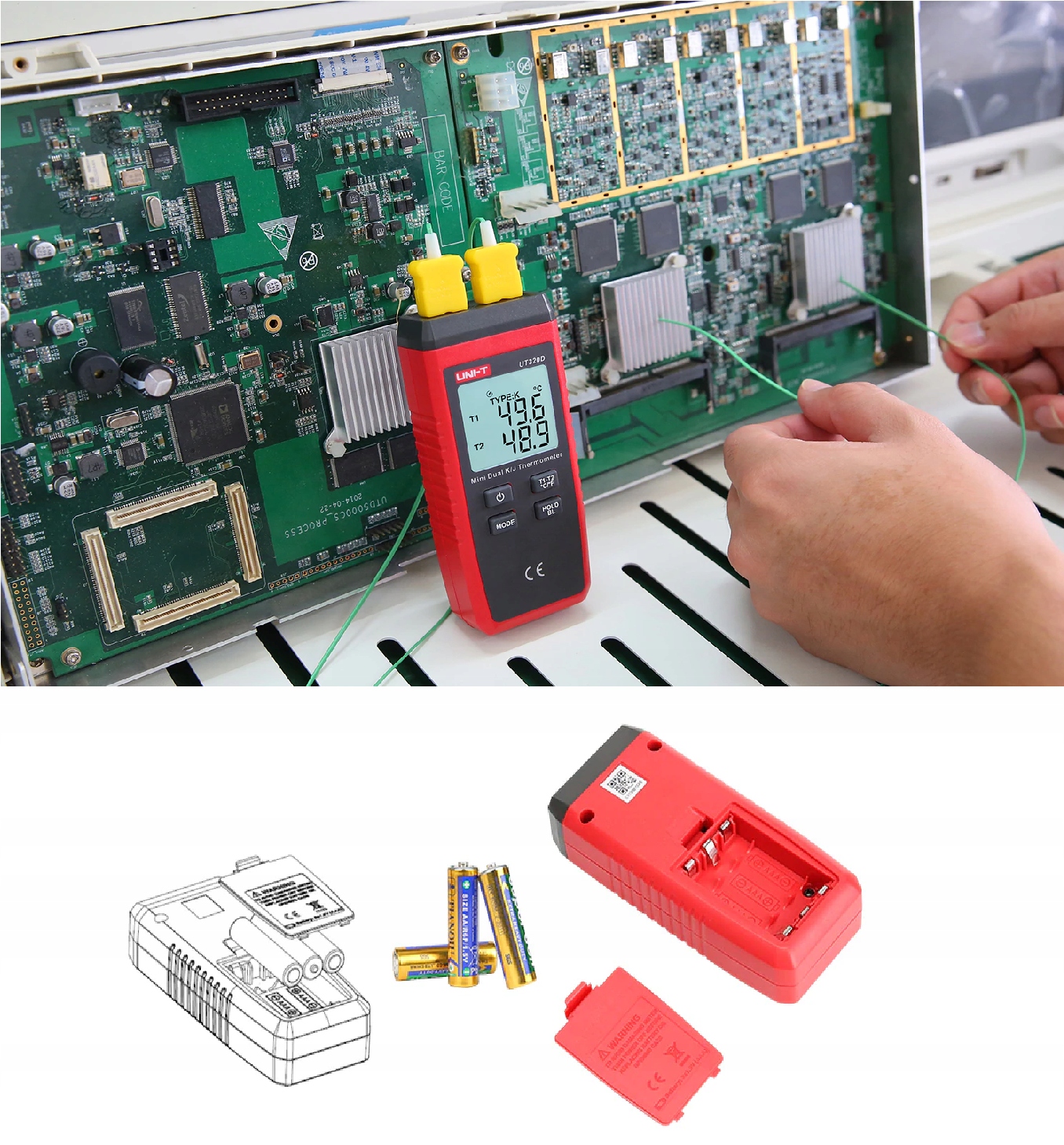 Стандартное оборудование: счетчик, батарейки, два K- щупы типа.