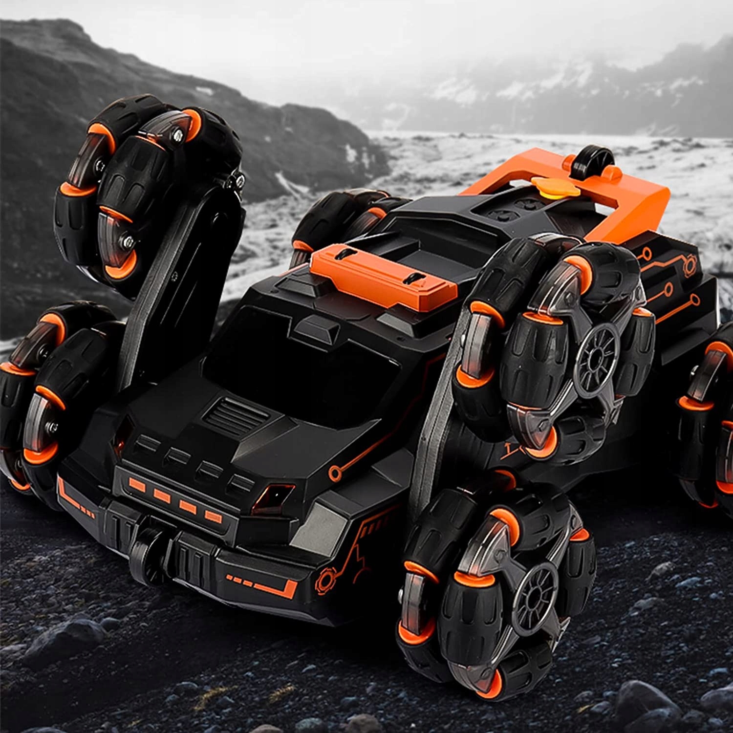 Двухфункциональный пульт дистанционного управления: в одном режиме вы надеваете часы на руку и управляете трюковой машиной, меняя жесты рук, в другом режиме вы используете пульт дистанционного управления, чтобы позволить езди на машине как хочешь. Шесть гигантских противоскользящих колес, соединенных ударопрочными пружинами, невероятно устойчивы, идеально подходят для специализированных операций, таких как повороты, заносы и перевороты, и созданы для превосходной управляемости и контроля. Доставляет детям и родителям невероятное удовольствие от радиоуправления.