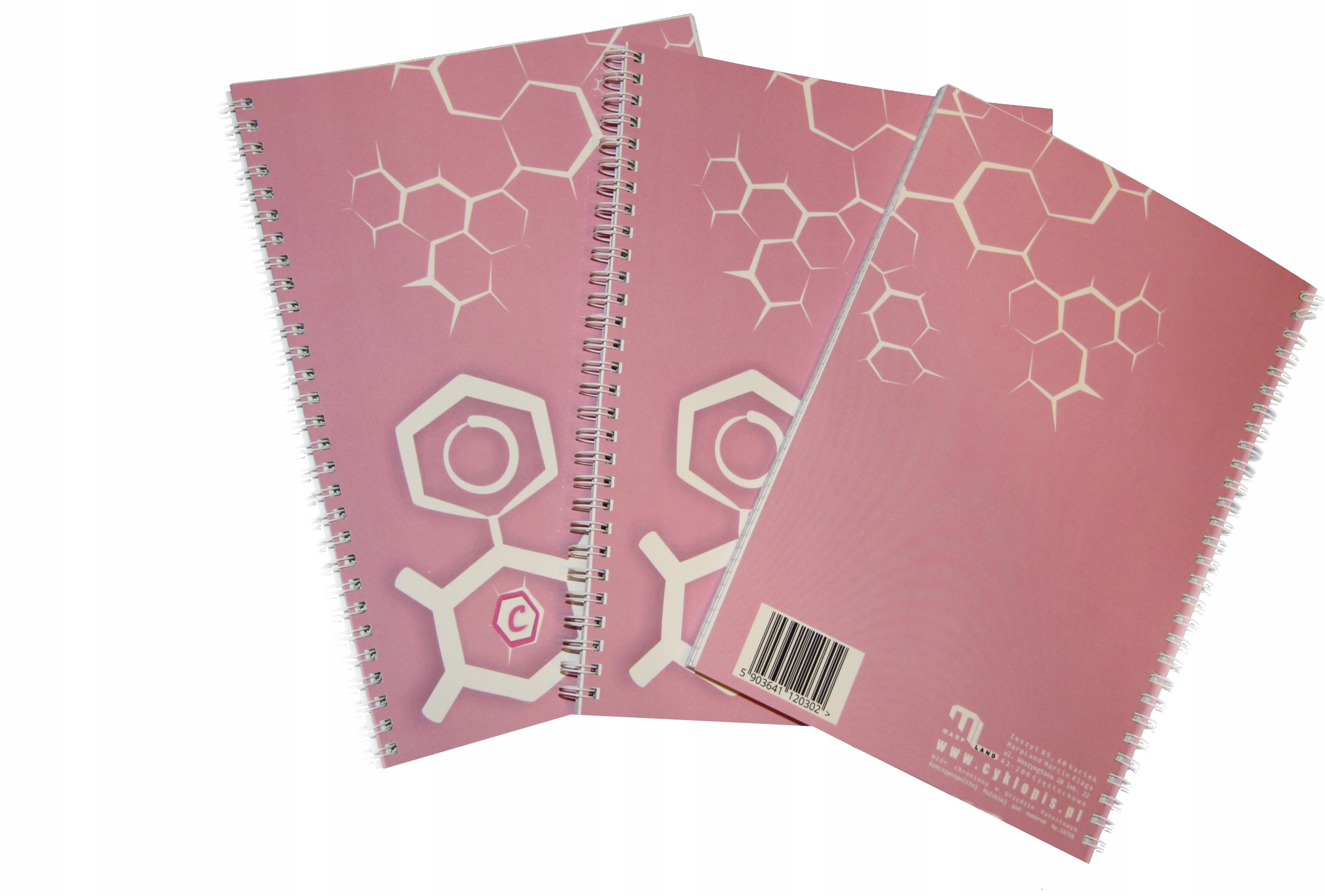 Страницы (кроме титульной и конечной страниц) печатаются с обеих сторон с уникальной комбинацией полей, заполненных шестиугольниками, и полей, заполненных сеткой. Шестиугольники, среди прочего, облегчают: рисование колец ароматических соединений, а сетка позволяет делать заметки. Кроме того, его можно использовать для настольных игр. Внутри блокнота можно найти несколько узоров карточек, собранных в пачки по несколько десятков повторений. На фотографиях, добавленных на аукцион, вы можете увидеть выкройки, использованные в этой версии блокнота. Использование спирали облегчает перелистывание страниц и предотвращает закрытие блокнота. Спираль не сильно выступает за поверхность блокнота, поэтому писать в блокноте не составит труда.