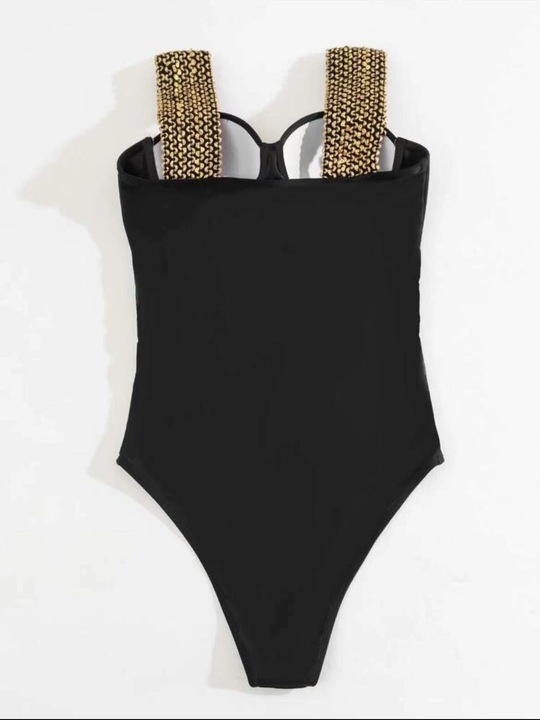 Комбинезон дополнен жесткими чашками и бюстгальтером-балконетом, который красиво подчеркивает грудь. Бретели с золотым декором придают костюму шик и элегантность.