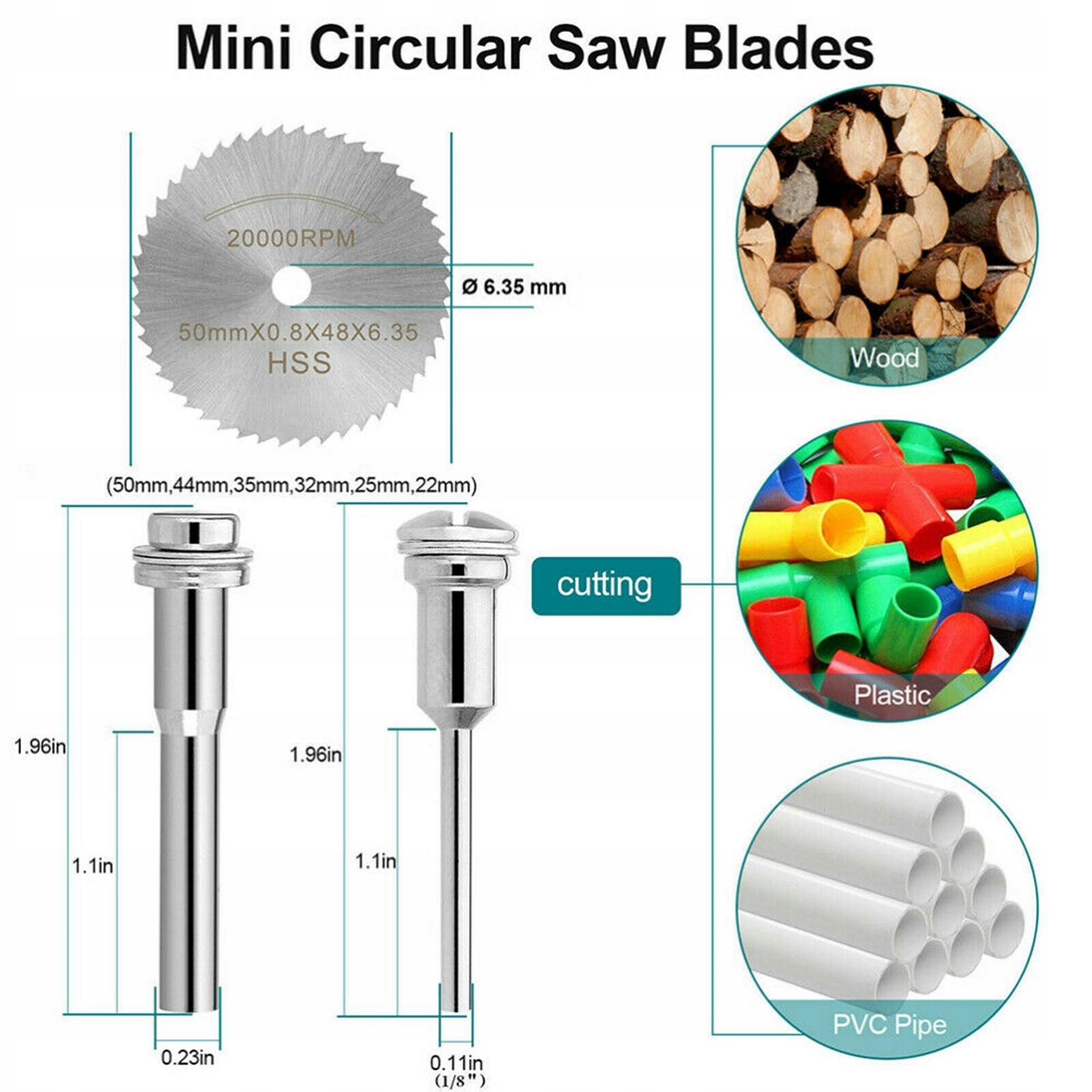 6 шт. диаметр пильного полотна из быстрорежущей стали: 22/25/32/35/44/50 мм, 10 шт. алмазный отрезной диск 22 мм, 10 шт. 32-мм отрезной диск из смолы с 8 хвостовиками.