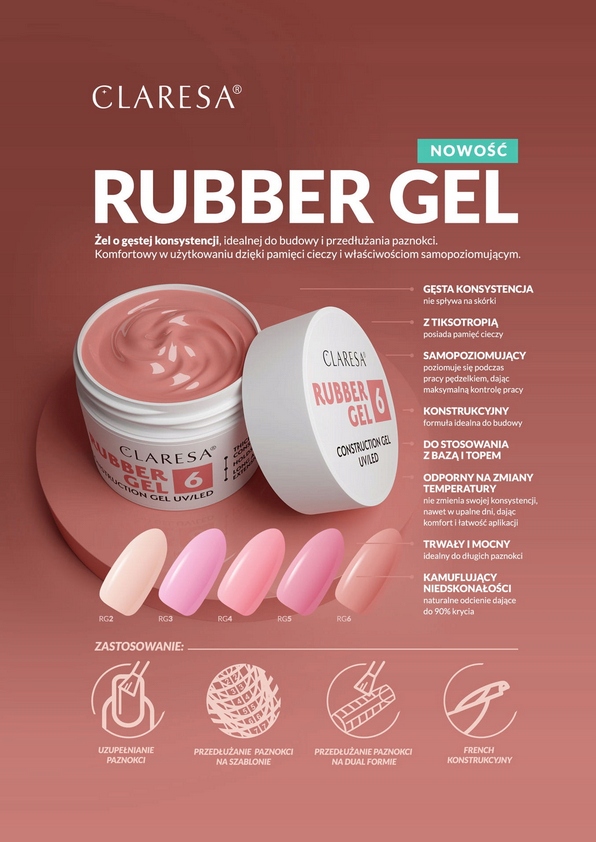 Rubber Gel by Claresa — продукт с уникальными свойствами. Его формула густая и устойчивая к температуре окружающей среды, что делает его идеальным для наращивания ногтей и наращивания пластин. Вы можете быть уверены, что даже в жаркие дни гель будет вести себя одинаково, и вы каждый раз будете строить идеальный скелет.