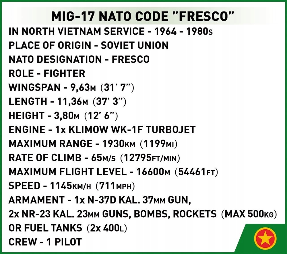 Благодаря интуитивно понятным инструкциям, основанным на понятных значках, конструкция проста. Самолет просто необходим всем любителям авиации, военного дела и военной техники. Это также идеальное дополнение к коллекциям, посвященным Вооруженным силам, войне во Вьетнаме, холодной войне и войне в Корее. В этой серии мы также выпустили польские самолеты LIM-1 и LIM-5, советские МиГ-15, чехословацкие С-102 и МиГ-17 в вариантах для ГДР и СССР. Блок блоков полностью изготовлен в Польше, в Европейском Союзе.