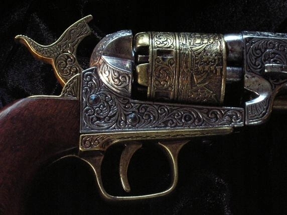 Вращающийся барабан, вмещает 6 патронов (МОЖНО СТРЕЛЬБАТЬ С НАСАДКАМИ). Под стволом установлен рабочий рычаг-зажим. Данная модель имеет богатое декорирование.