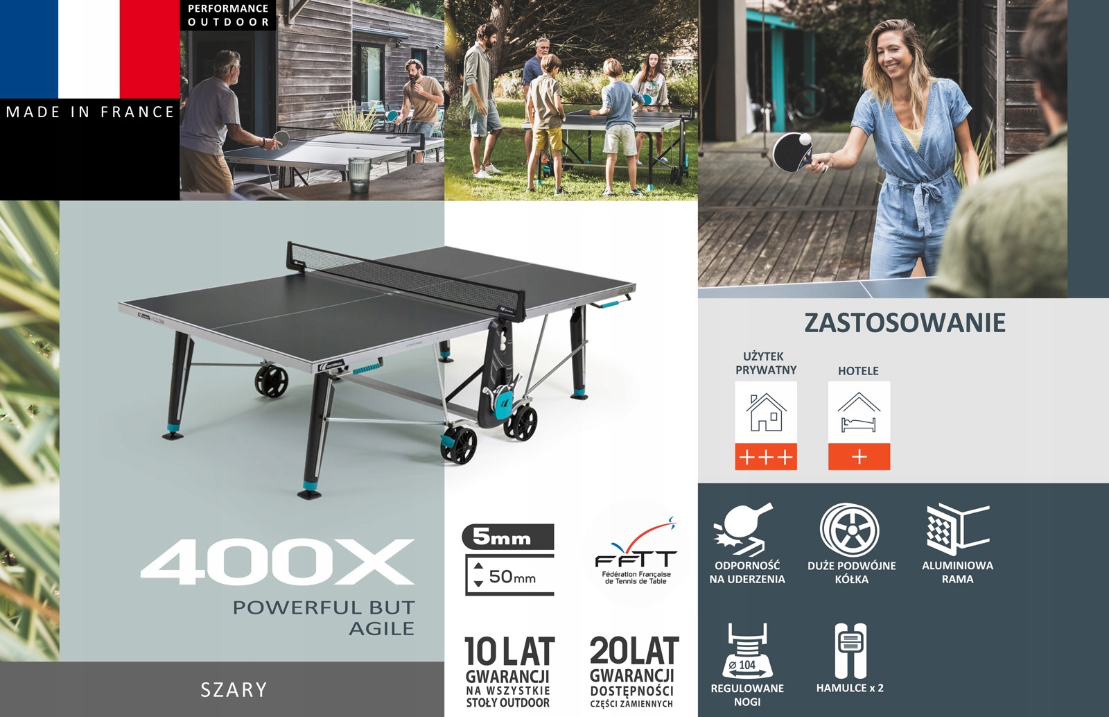 Теннисный стол 400X от Cornilleau — топ-модель серии Sport, предназначенная для использования на открытом воздухе. Это идеальный выбор для всей семьи. Благодаря двойной системе безопасности DSI, двойным колесам и мощным тормозам с ним справится любой. Стол устойчив к погодным условиям и идеально подходит для сада или террасы.