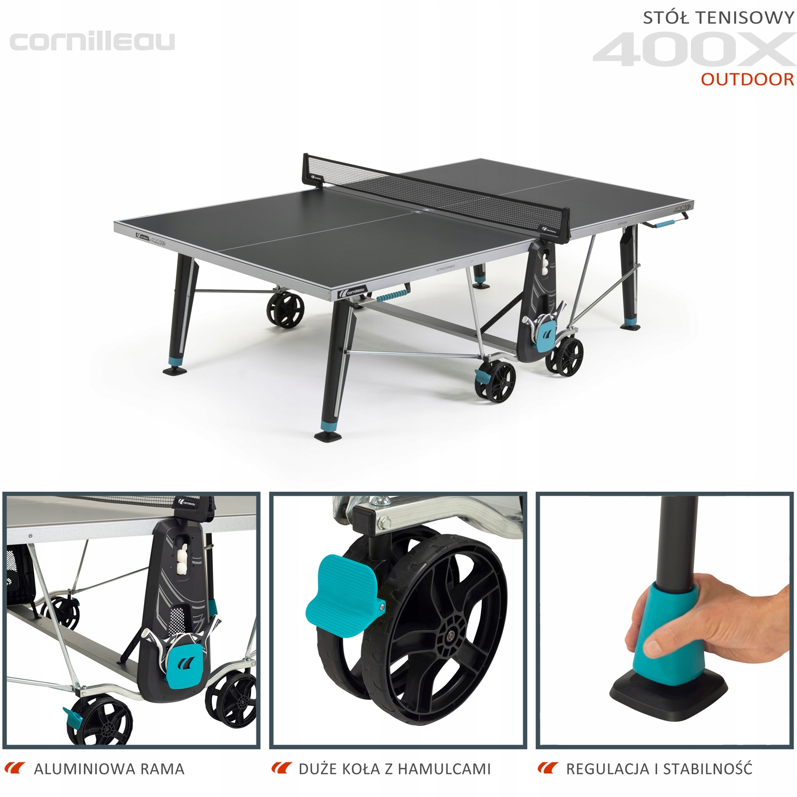 БОЛЬШИЕ КОЛЕСА С ТОРМОЗАМИ:Столы для пинг-понга Cornilleau оснащены большими двойными колесами толщиной 32 мм и диаметром 200 мм. Такое решение увеличивает поворот колес и устойчивость стола. Колесо большего размера легко перекатится через большие препятствия, такие как лестницы, пороги, камни. Он легче преодолевает густую траву и другие неровные поверхности, а два тормоза обеспечивают превосходную устойчивость и безопасность во время игры. Это также особенно полезно, когда стол хранится на слегка неровной поверхности.