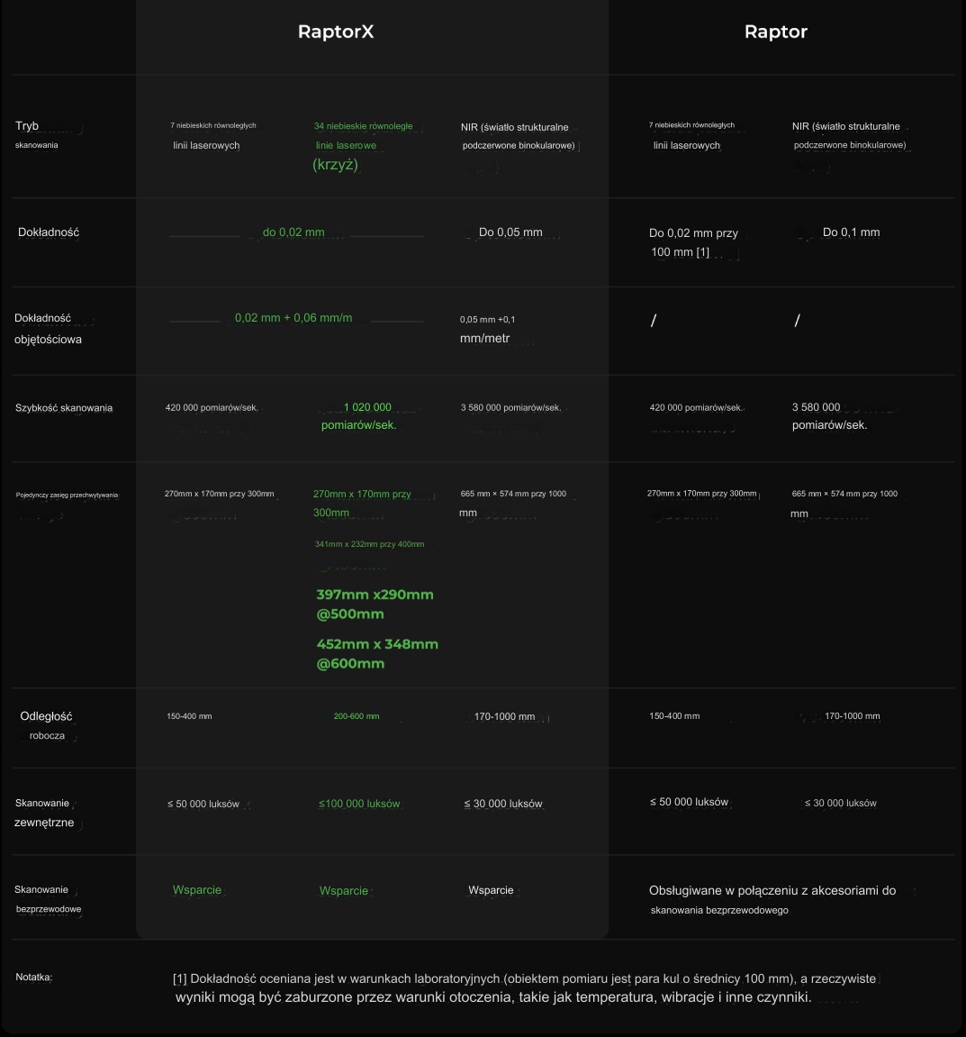 Raptor X оснащен 41 лазером синего света и решениями NIR, обеспечивающими производительность в различных приложениях, таких как 3D-печать, реверс-инжиниринг, медицина и AR/VR. Есть функция четырехчасовой работы от аккумулятора и возможность использования беспроводного доступа в Интернет. Расширенные возможности Раптора