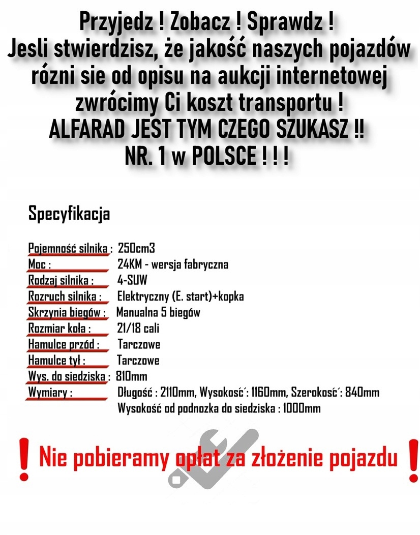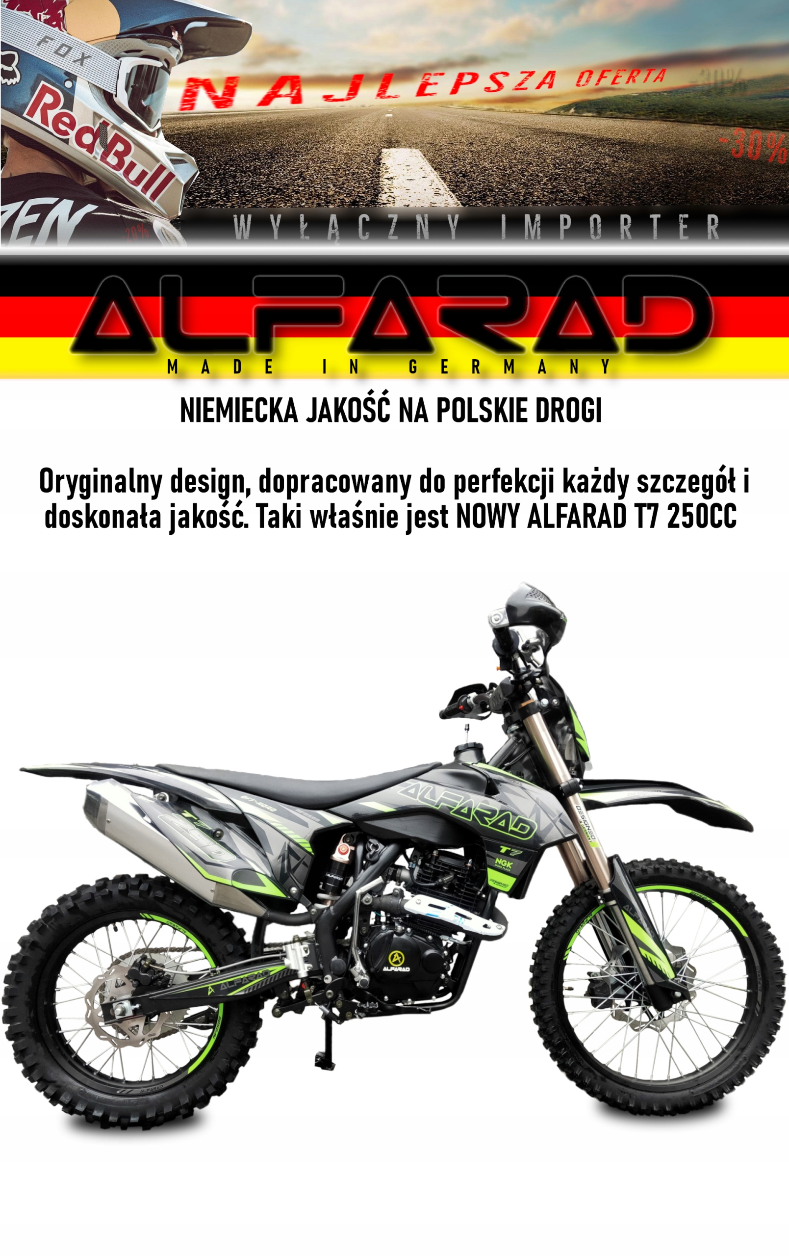 Просматривая «Cross 250 CC Alfarad T7 новый», вы можете быть уверены, что данный товар из каталога «Мотоциклы и квадроциклы» будет доставлен из Польши и проверен на целостность. В цене товара, указанной на сайте, учтена доставка из Польши. Внимание!!! Товары для Евросоюза, согласно законодательству стран Евросоюза, могут отличаться упаковкой или наполнением.
