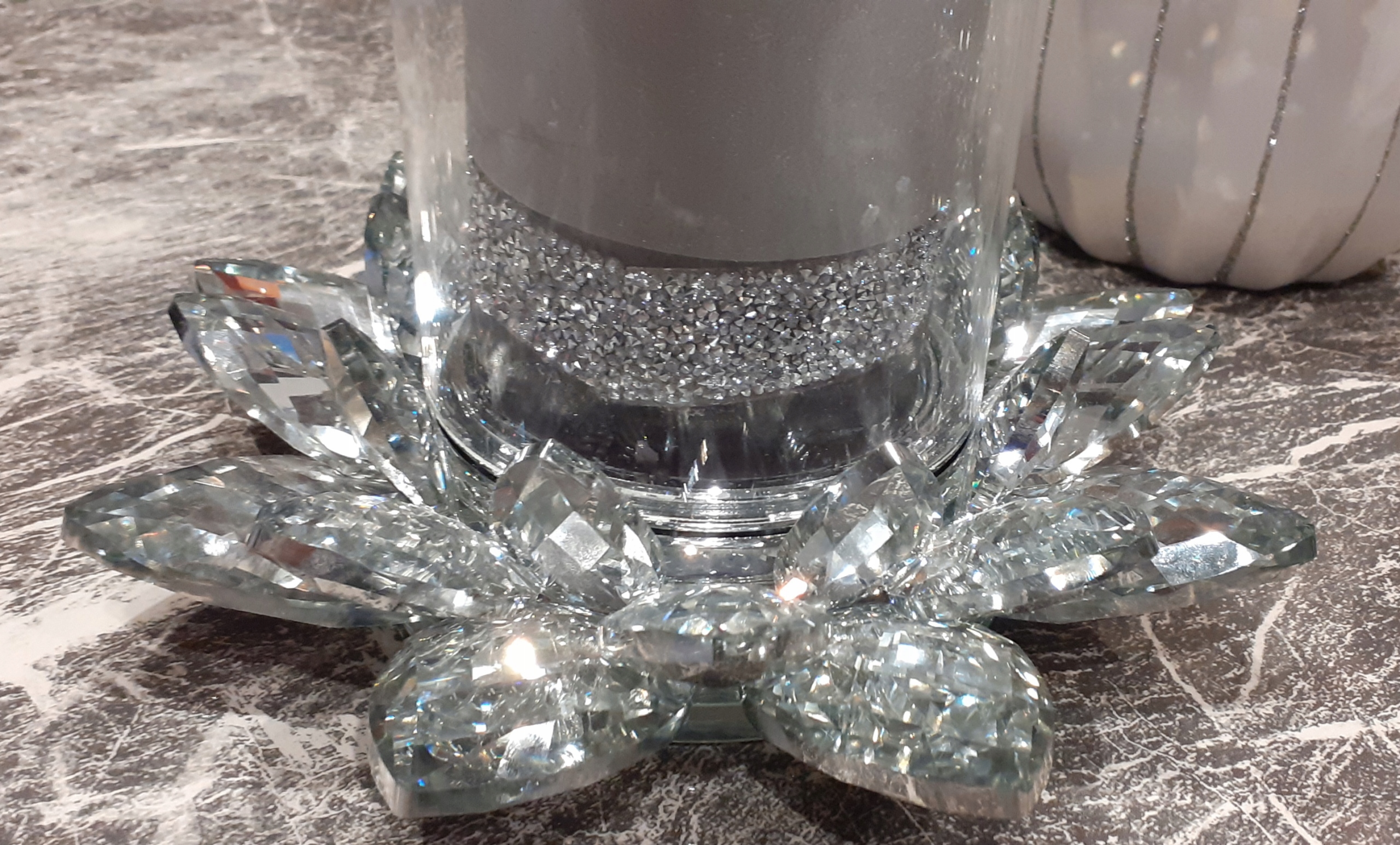 Подсвечник Cristal Shine чрезвычайно декоративен и одновременно утончен. Имеет раскидистую основу, напоминающую цветок. Он облицован граненым стеклом, напоминающим бриллианты. В центре подставки находится стеклянная трубка. Поместив в него свечу, мы завершим ее обустройство.