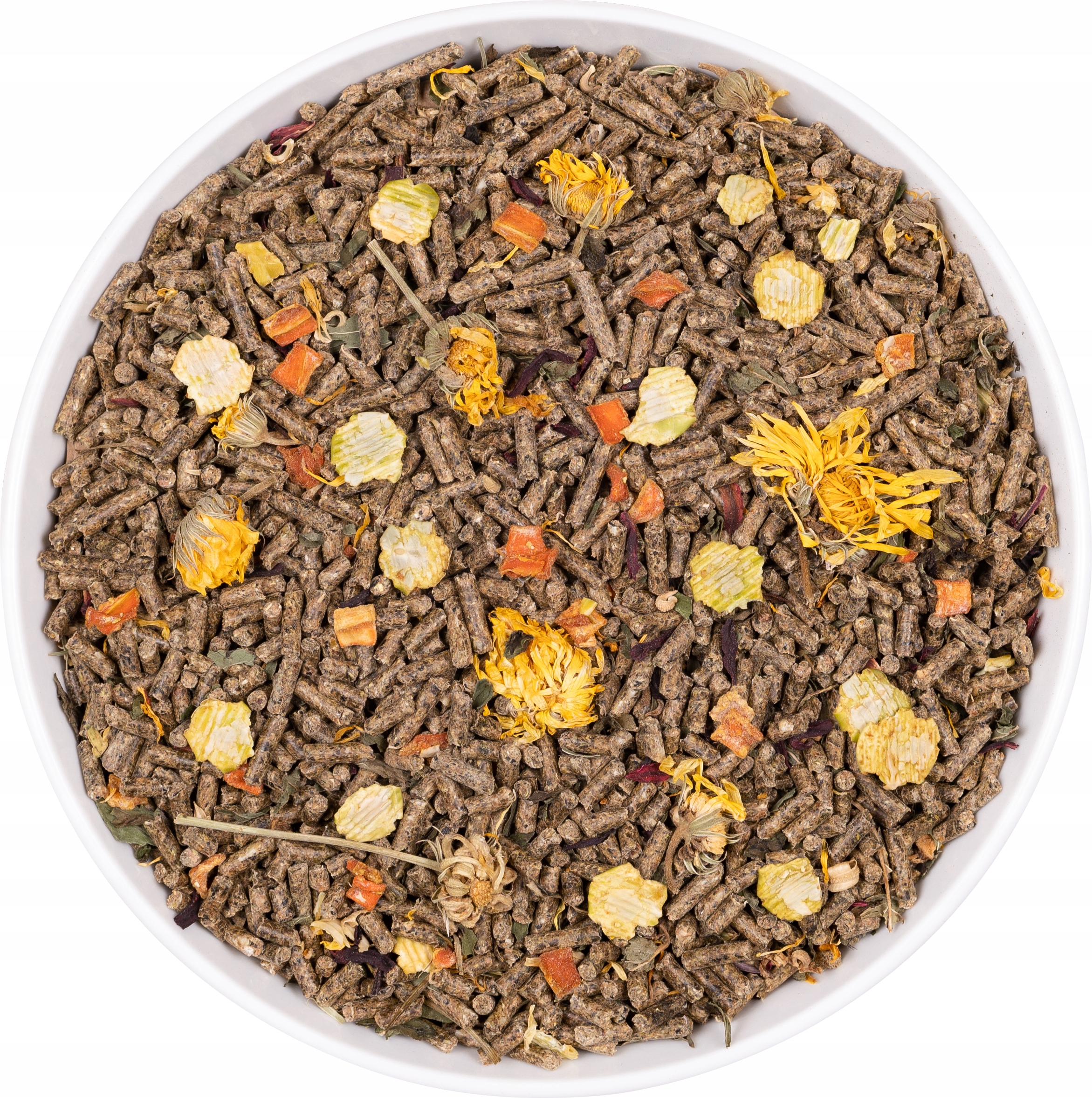- Высокое содержание сена (32%) – более 45 видов, в том числе тимофеевка, люцерна и горное сено способствуют износу зубов и здоровому пищеварению.
