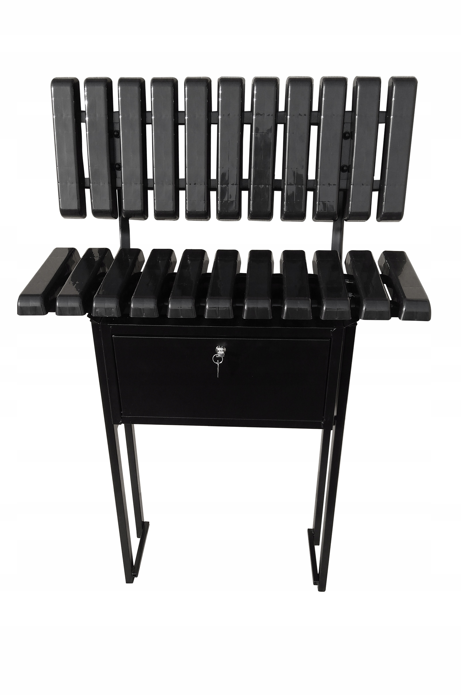 Вся конструкция окрашена порошковой краской в черный глянец.И сиденье, и спинка изготовлены из планок (ребер) ПВХ, устойчивых к атмосферным явлениям.