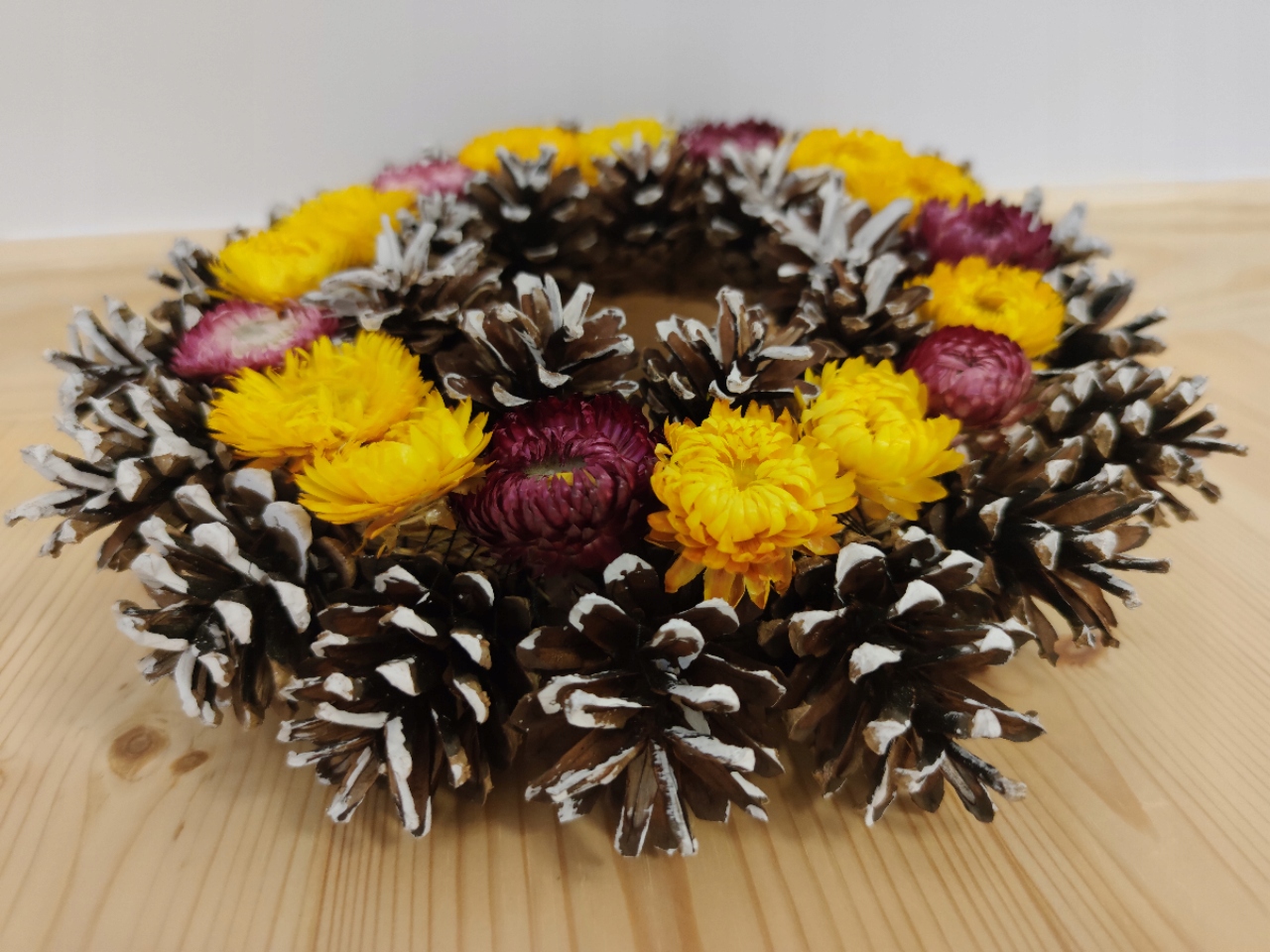 Украшение из сосновых шишек и цветов на соломенной основе (венок)
