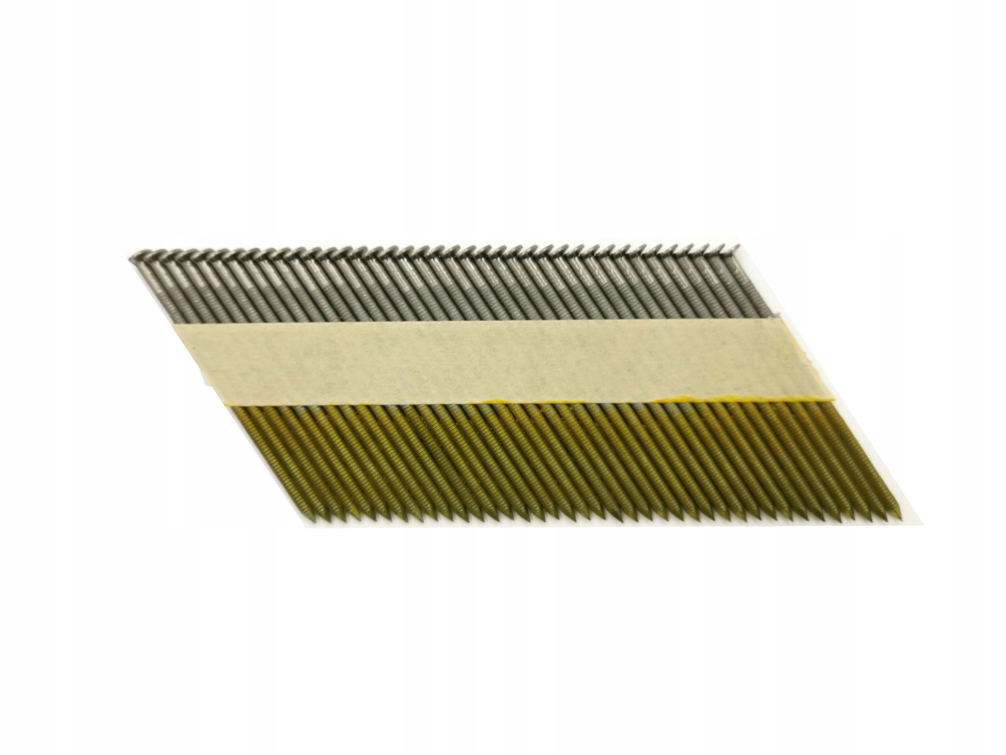 Гвозди, скрепленные бумагой, это гвозди для гвоздезабивателя пневматические, газовые и электрические. Этот тип соединителя чаще всего используется в строительстве кровельщиками. Соединяются под углом 34 градуса.Гвозди соединяются последовательно.
