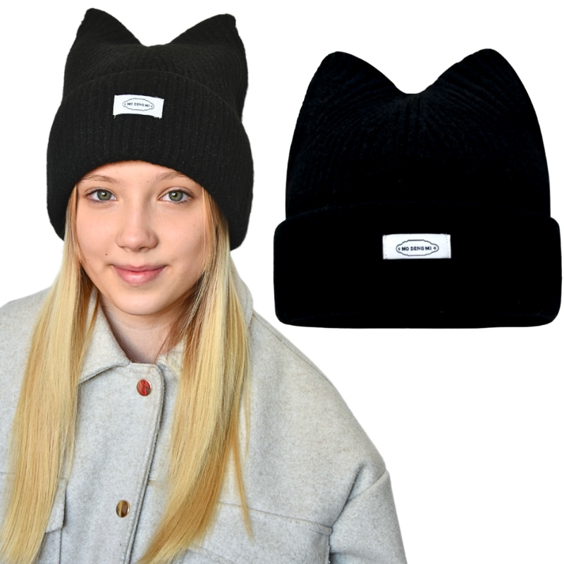 CZAPKA DAMSKA ZIMOWA MŁODZIEŻOWA CZARNA UCIĄGLIWA WYWIJANA KOCIE USZY