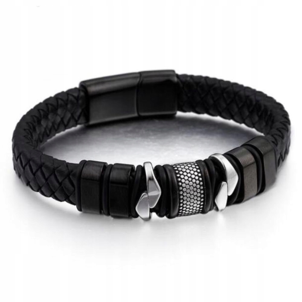 CZARNA BRANSOLETA SKÓRA Z OBRĘCZAMI PLECIONKA STAL