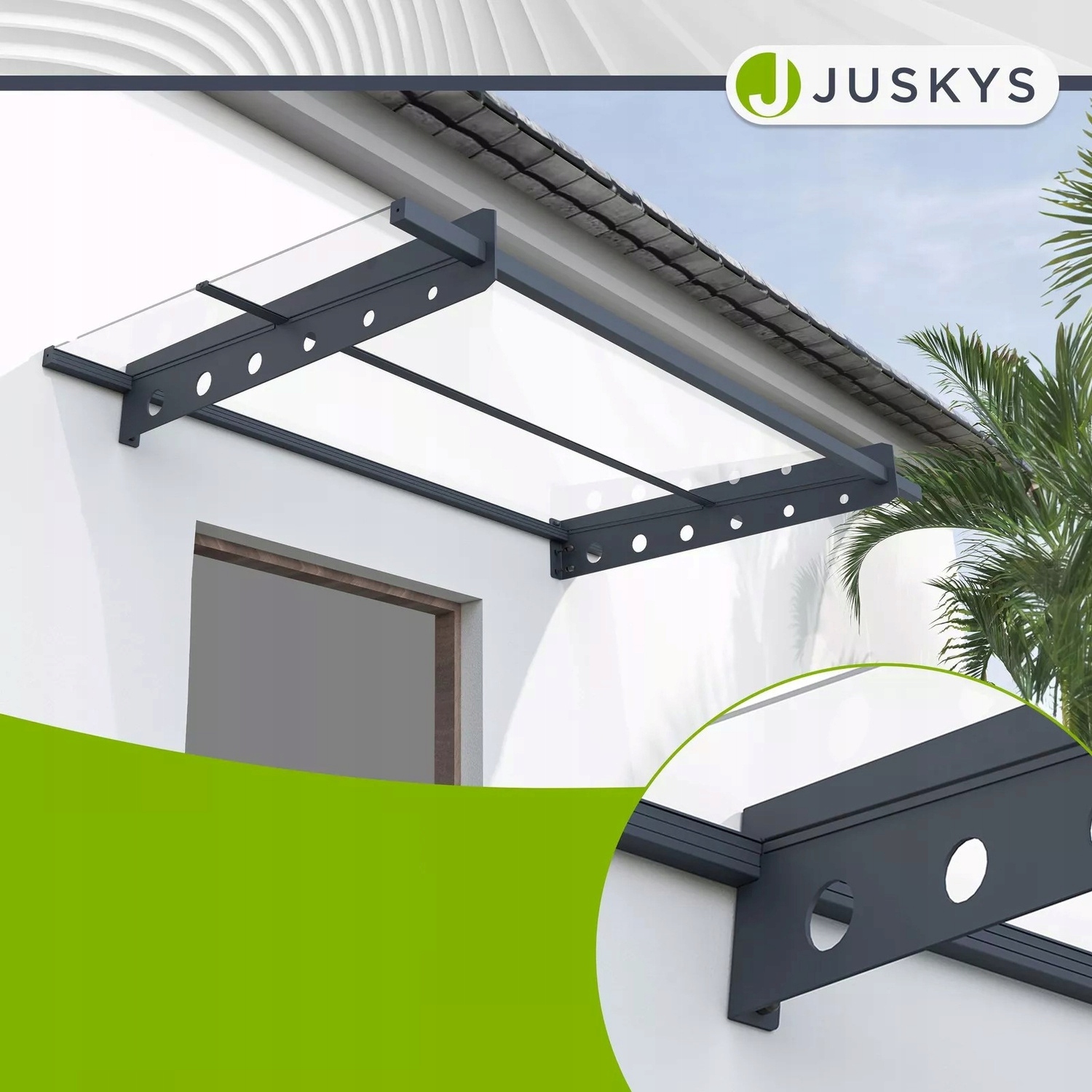 Манила немецкого бренда Juskys® - это практическая кровя над входной дверью, которая защищает от осадков и в то же время дает зданию современный, элегантный характер. Структура изготовлена из прочной стали и прозрачного акрилового стекла, она отлично работает снаружи, обеспечивая прочность и длительное использование. Благодаря компактным размерам 100 × 80 см, это идеально подходит как для одно- и для коммерческих зданий. Установка крыши быстрая и простая.