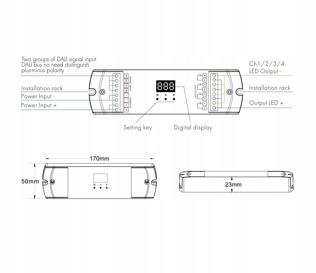 Контроллер DALI DA4-L позволяет управлять яркостью одноцветного светодиодного освещения (DT6), например одноцветных светодиодных лент, с возможностью выбора 1-4 адресов DALI и независимой работой каждого из четырех каналов. Каждый адрес может быть назначен вручную и отображен на дисплее контроллера или автоматически через ведущее устройство DALI. Устройство питается постоянным напряжением в диапазоне 12-48В постоянного тока (источник постоянного напряжения) с максимальным выходным током 5А на канал. Его максимальная выходная мощность составляет 4x(60-240) Вт. Этот контроллер работает в соответствии со стандартным протоколом DALI IEC 62386-102, IEC 62386-207 и совместим с продуктами DALI других производителей. Контроллер обеспечивает плавное ШИМ-регулирование яркости с логарифмической кривой регулировки яркости. Возможность выбора частот ШИМ 1000/2000/4000/8000 Гц. Этот профессиональный диммер DALI защищен от перегрева, перегрузки и короткого замыкания. Он изготовлен из фирменных комплектующих, на него распространяется пятилетняя гарантия.