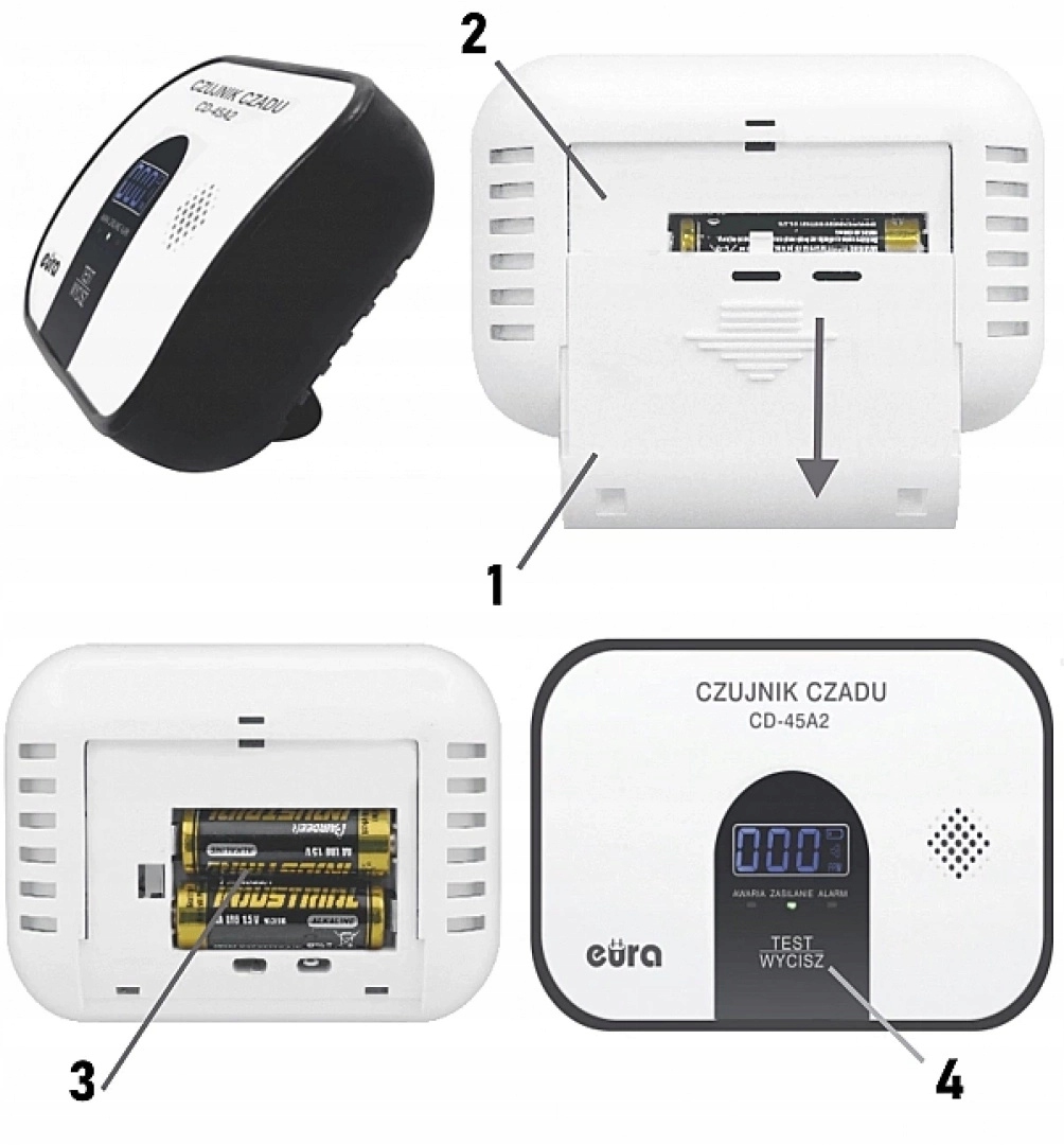 - CD-45A2 карбоновый Детектор угарного газа следует размещать на уровне головы, например. в спальне – около 0,7 м, а в гостиной – около 1,5–1,8 м от пола.