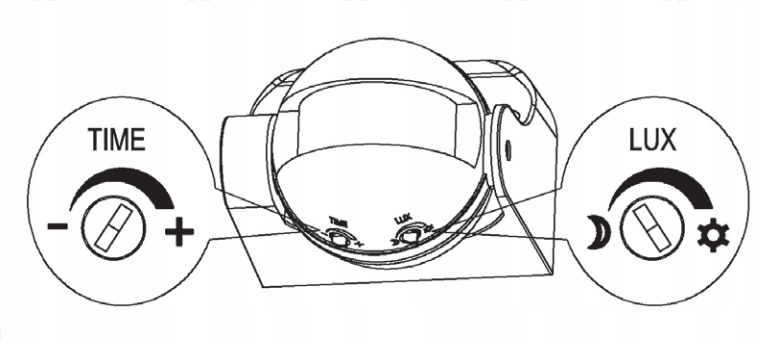 Используйте потенциометр времени, чтобы установить время, по истечении которого освещение должно включаться выключаться с момента обнаружения датчиком последнего движения. Чтобы увеличить время задержки, поверните потенциометр времени по часовой стрелке. Максимальная временная задержка составляет примерно 5-9 минут. Чтобы уменьшить время задержки, поверните потенциометр времени против часовой стрелки. Минимальная задержка составляет примерно 7–13 секунд.