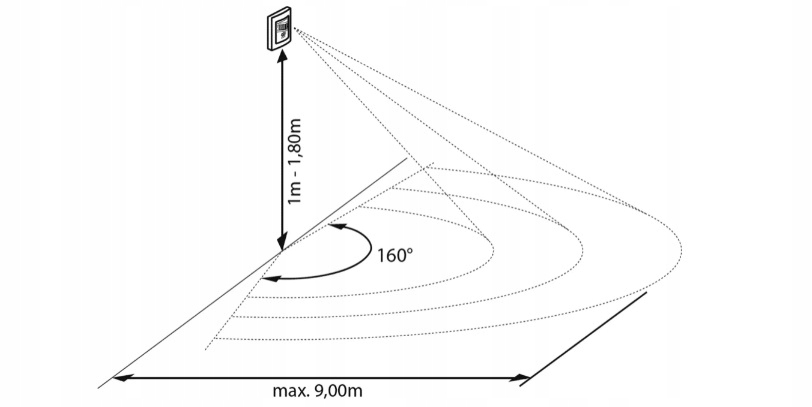 - Дальность обнаружения: Макс. 9 м (<24°C) / 160°