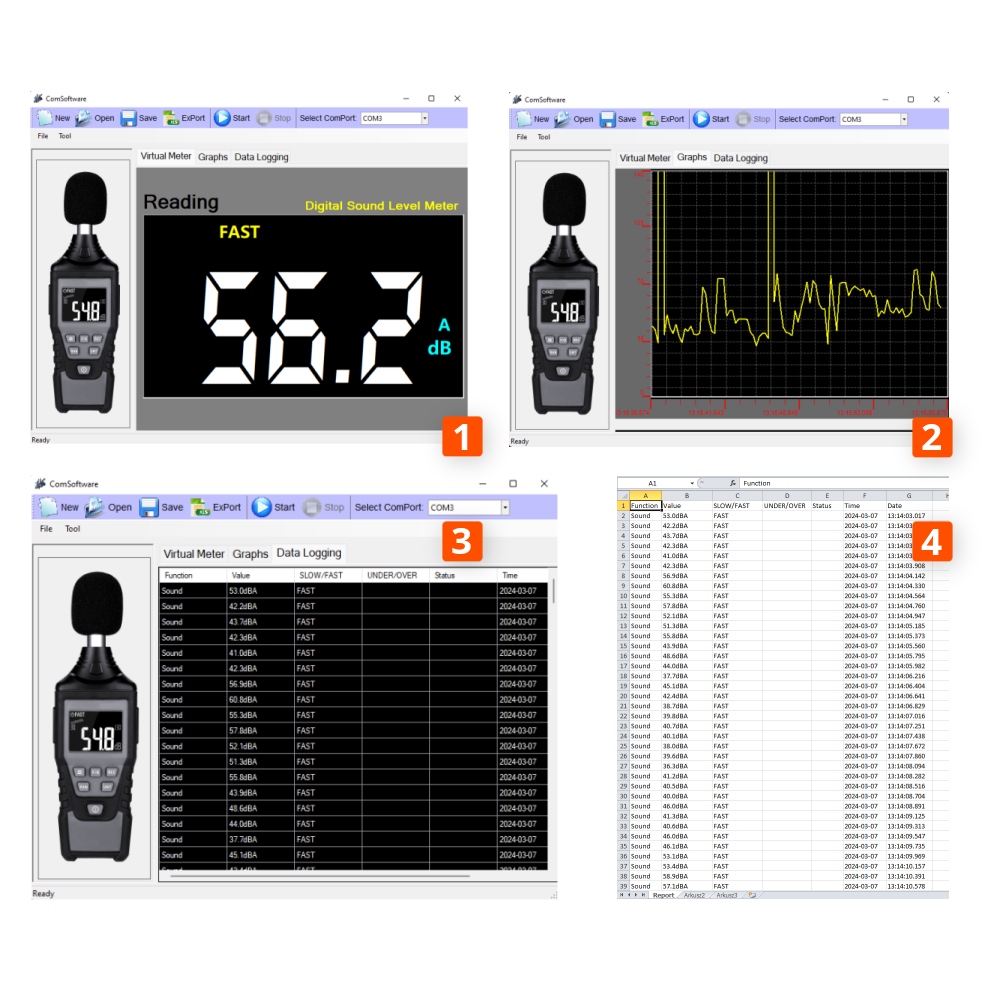- Специальное приложение позволяет записывать данные в режиме реального времени, экспортировать данные в электронную таблицу Excel, создавать звуковые графические диаграммы.