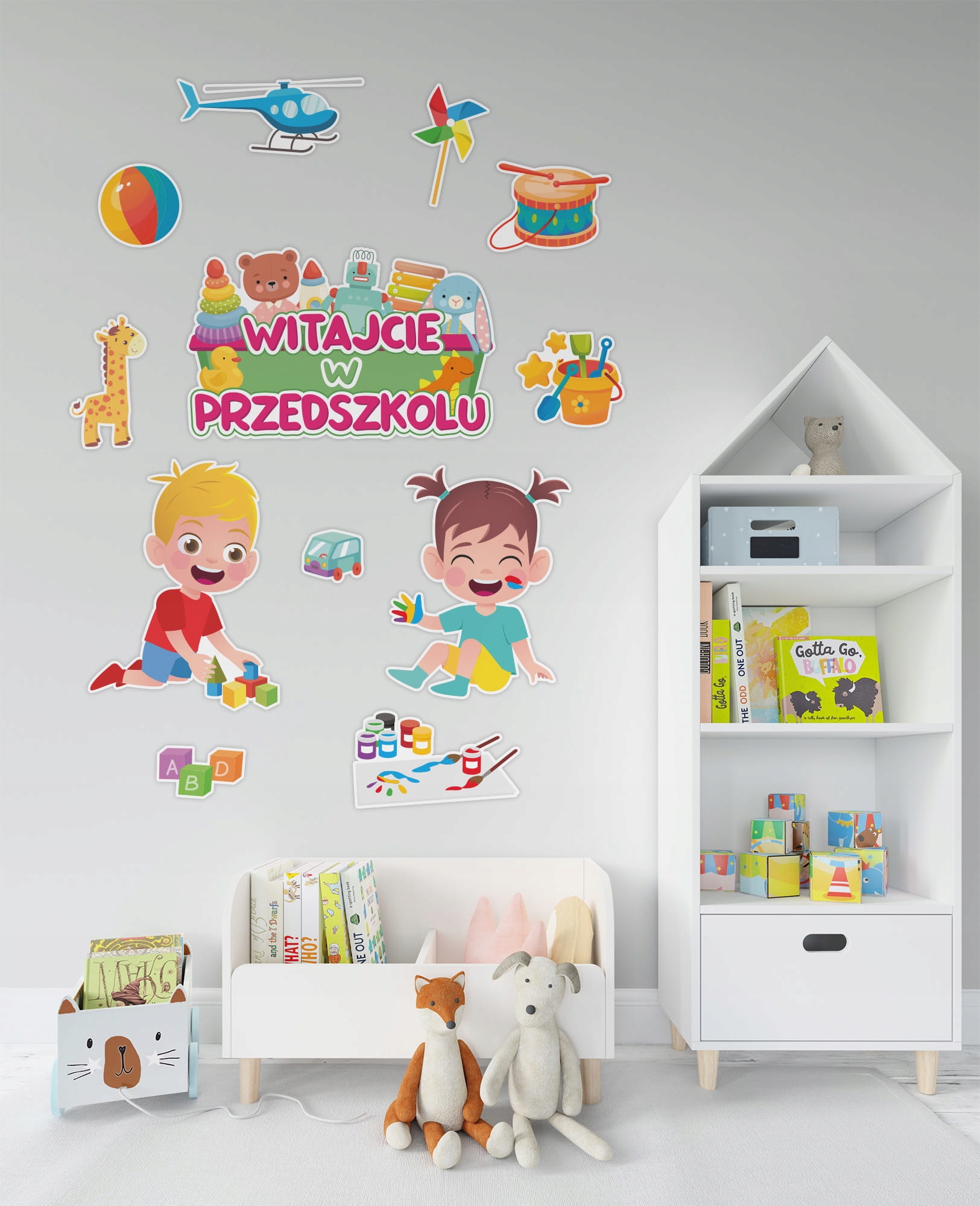 В состав набора входят: 2 детские фигурки, 9 декоративных элементов, связанных с детсадовской тематикой, и большая надпись «ДОБРО ПОЖАЛОВАТЬ В ДЕТСКИЙ САД» на коробке с игрушками.