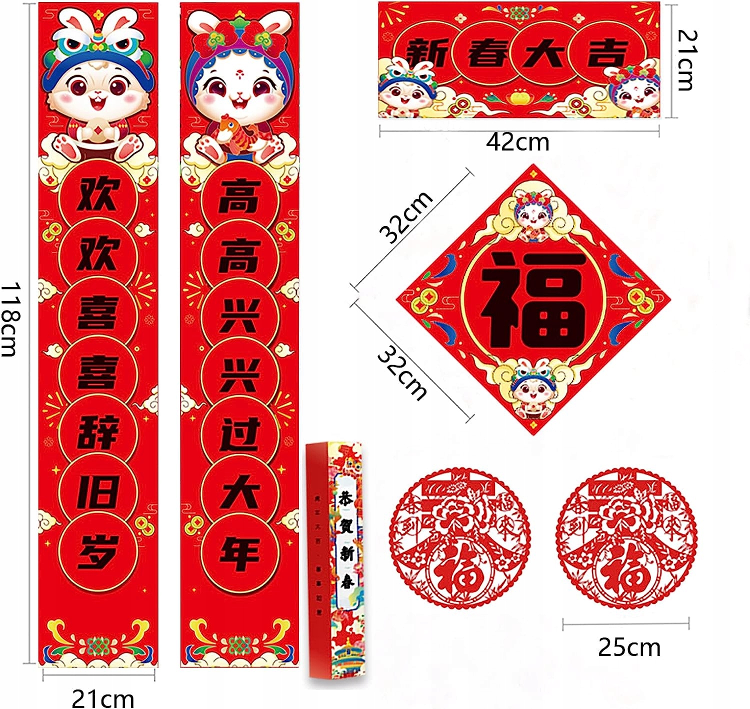 - Размеры: куплет : 118x21 см, горизонтальная наклейка 42x21 см, 1 наклейка с благословением 32x32 см, 2 электростатическая оконная решетка в китайском стиле 25x25 см, 1 изысканная упаковка 35x4,5 см.