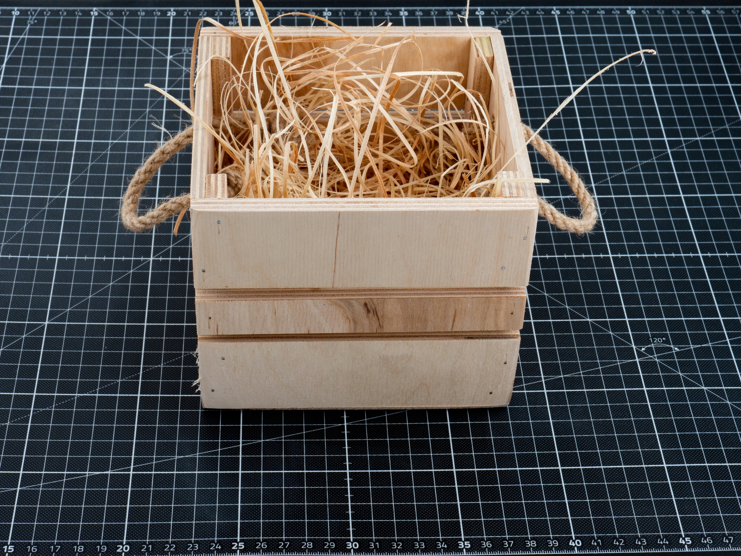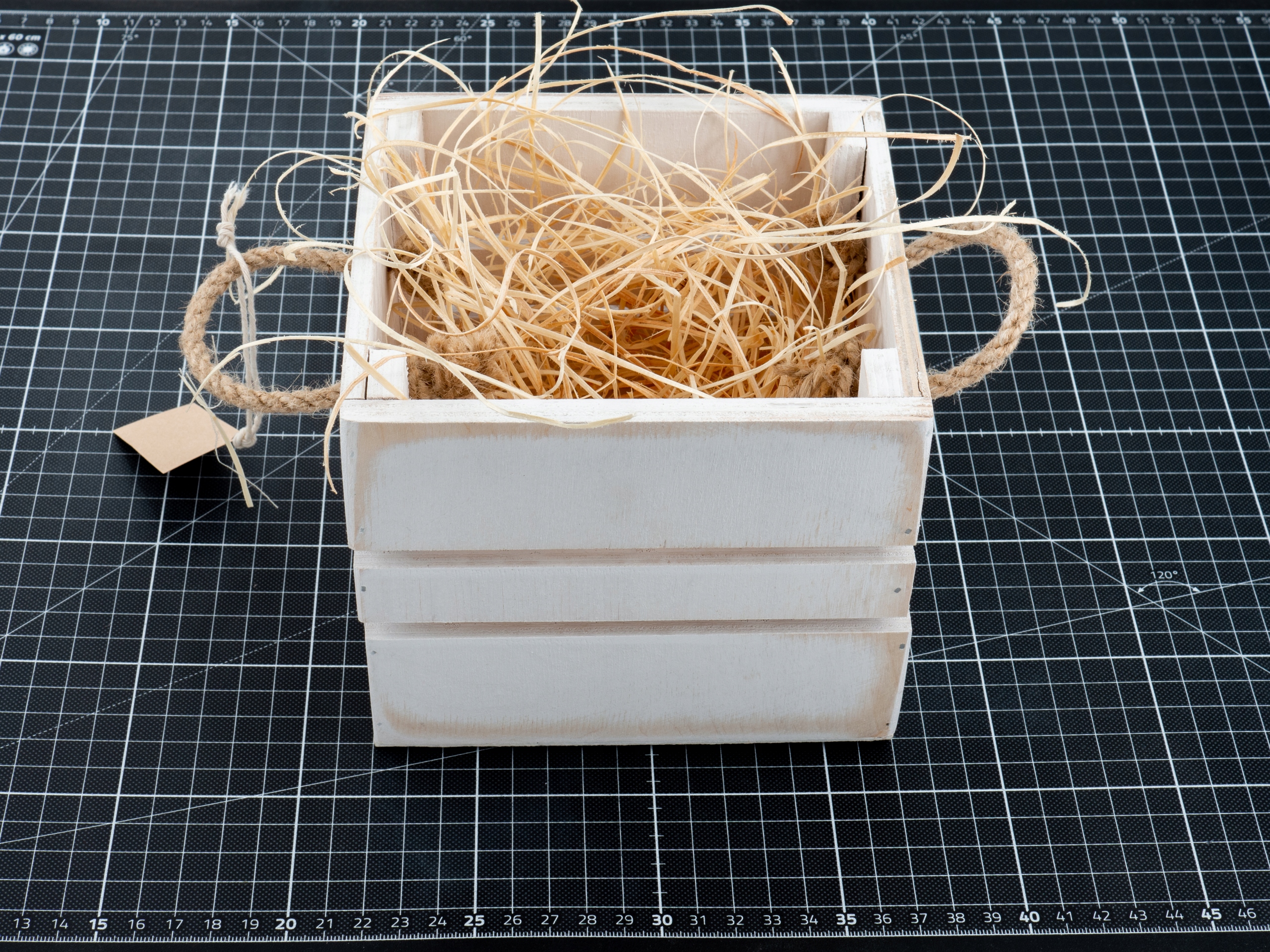В каждую коробку, объёмом примерно половину коробки, добавляем декоративный наполнитель в виде древесной шерсти («сена»).
