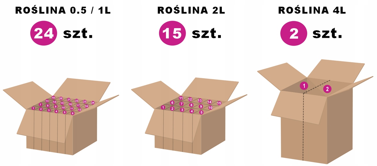 0,5/1 литр - 24 шт | 2 литра - 15 шт | 4 литра - 2 шт