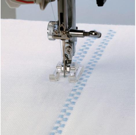 Благодаря своей особой конструкции (большому свободному пространству между полозьями) прижимная лапка идеально подходит для шитья декоративными строчками и для пришивания аппликаций. Создаваемый машиной стежок легко помещается под направляющие прижимной лапки, поэтому он может плавно скользить по материалу, не застревая в создаваемом стежке. Кроме того, открытое пространство в передней части стопы обеспечивает очень хороший обзор перед ступней.