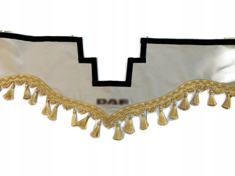Предмет продажи — бежевая шторка на лобовое стекло для грузовиков MAN с золотой отделкой и вырезом для GPS. Изделие из плотного флиса, крепится к машине с помощью липучки (входит в комплект). Ширина шторы - примерно 235 см.
