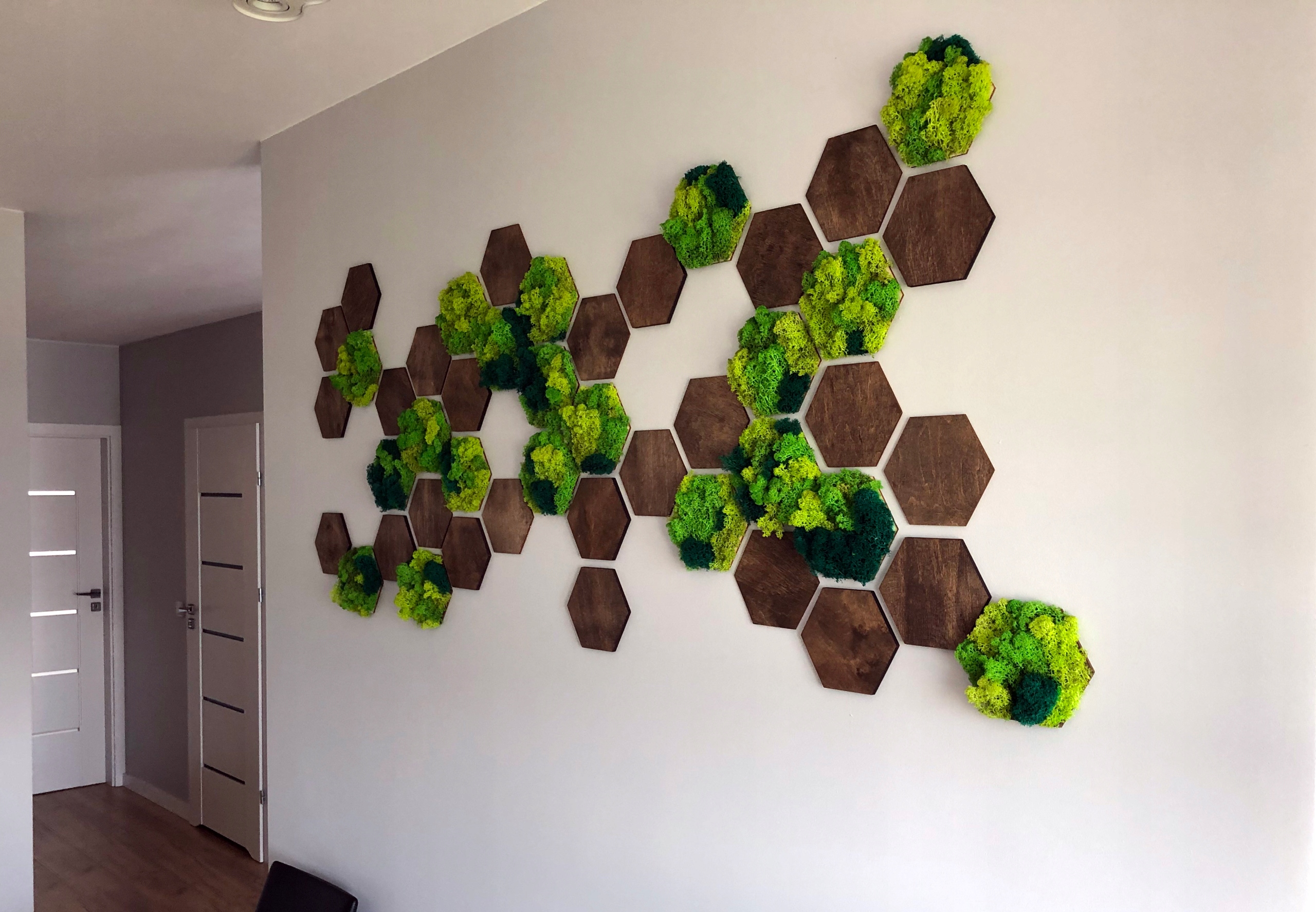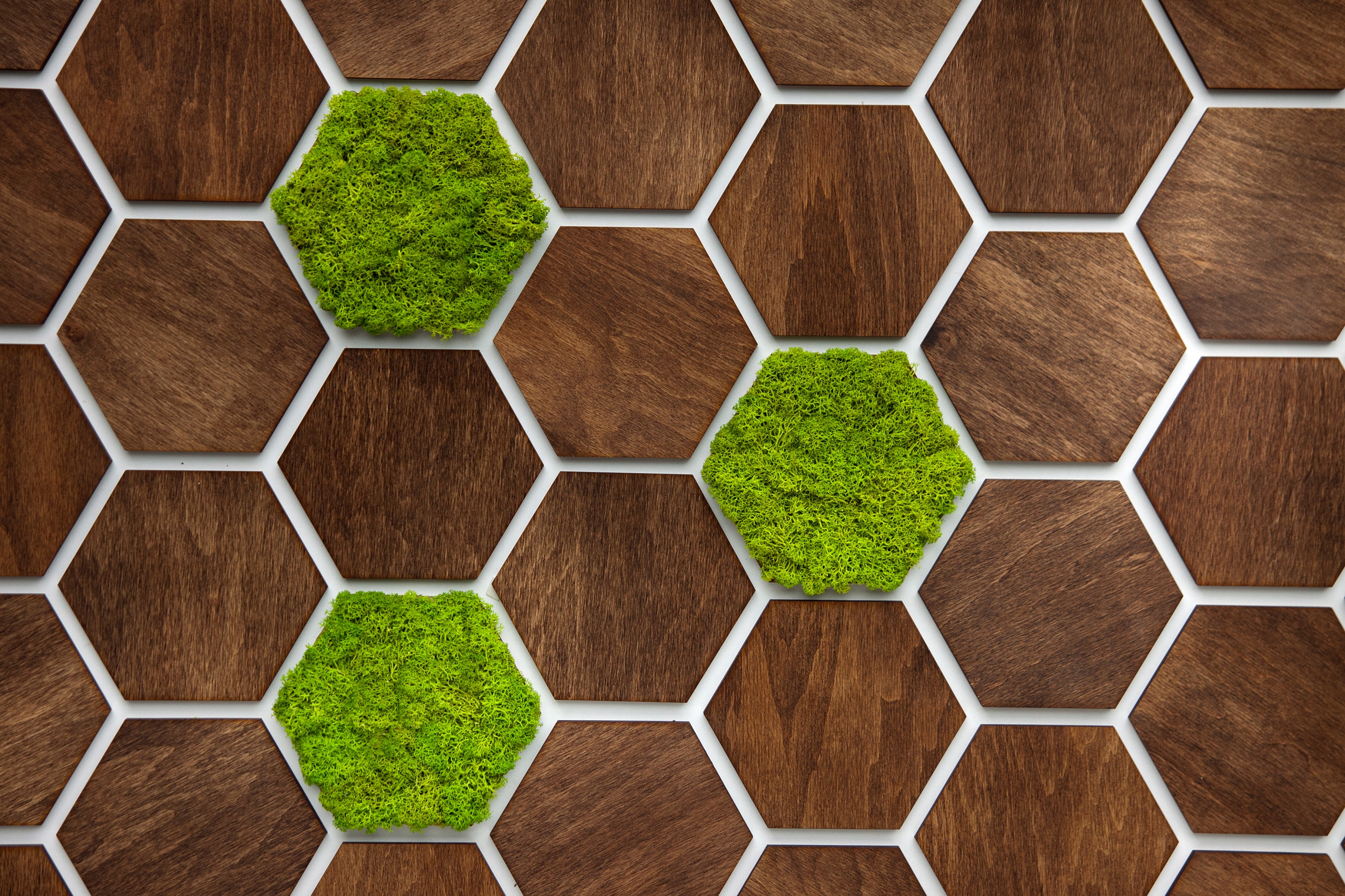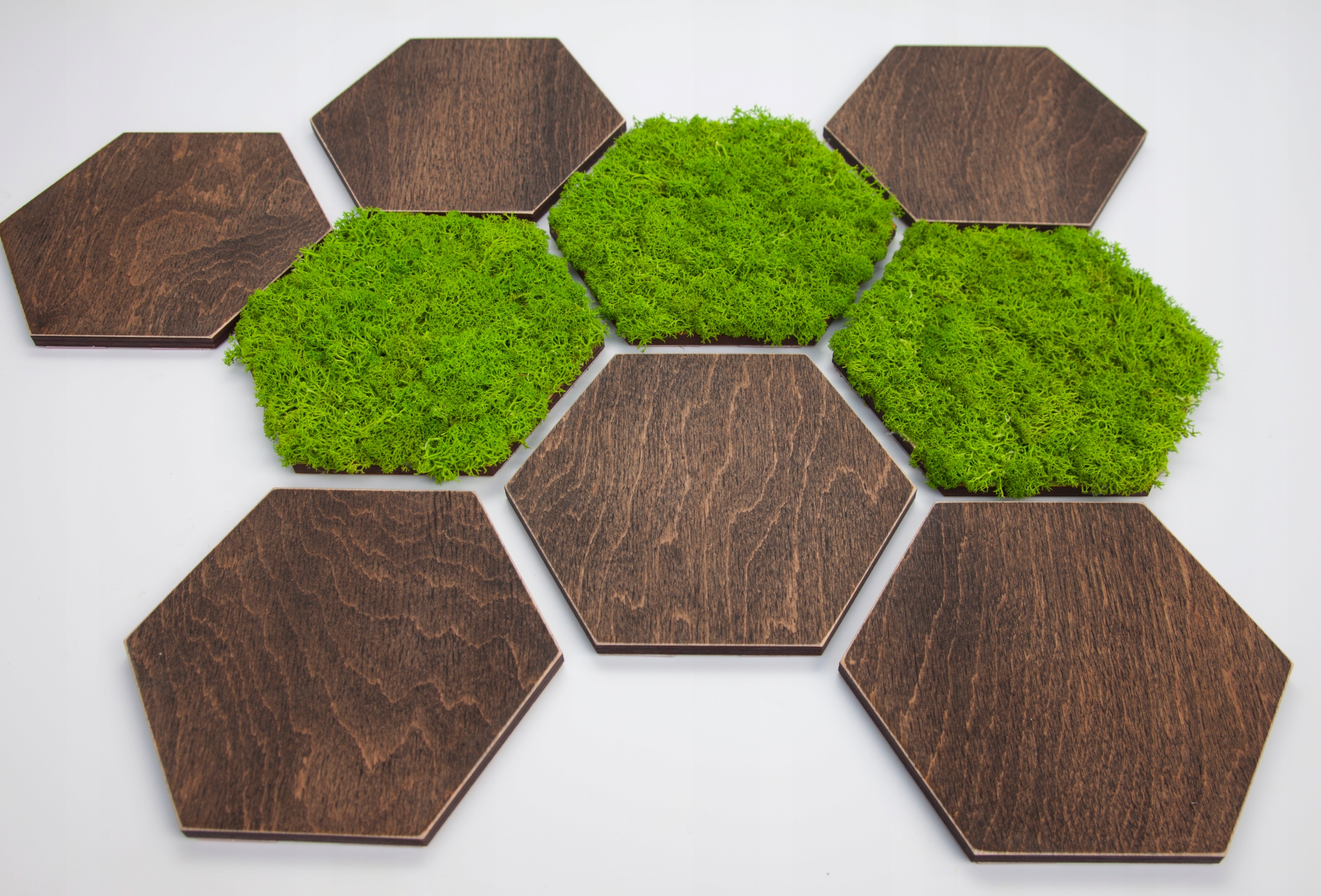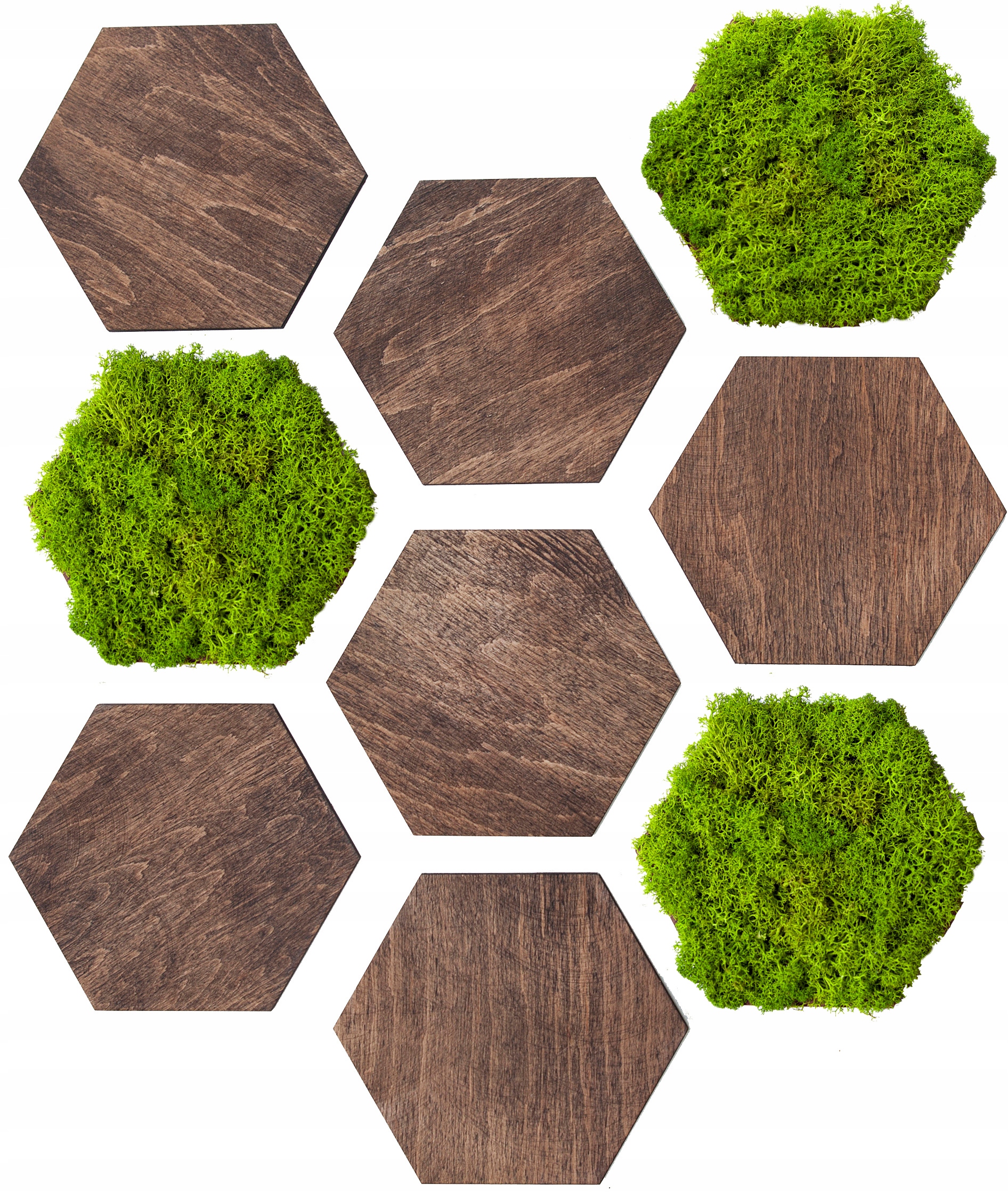 Набор состоит из 9 деревянных гексагонов, из которых 3 покрыты срезанным мхом в весеннем зеленых.