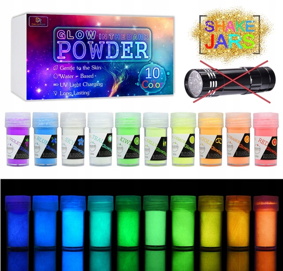 jumbo package - 10. Элемтная упаковка (в общей сложности 200 г) с пигментами, сияющими в темноте, которые придают вашим художественным проектам чудесный блеск. Каждый пигмент эпоксидной смолы встречается в отдельном блюде, которое облегчает его использование и контроль без отходов и грязи. Благодаря прикрепленной ультрафиолетовой лампе, краситель слизи может быть заряжена быстрее и плотно